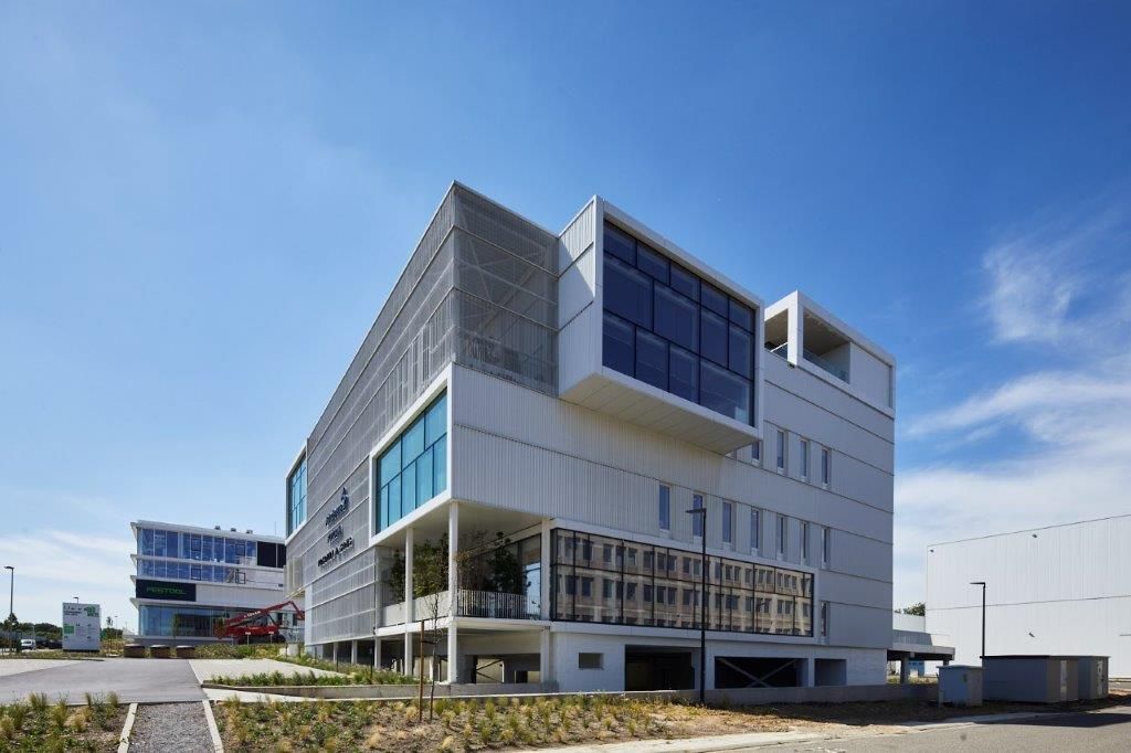 Hét uithangbord van het fraaie bedrijfsgebouw is de open staalstructuur aan de voorgevel. De zware betonnen TT-liggers in de vloeren maakten het moeilijk om het gebouw uit te rusten met nieuwe trappen en liften. Vandaar de keuze voor een lichte, transparante voorzetstructuur die alle bedrijfsunits en de parkings ontsluit. “Zo kreeg het gebouw ook meteen een flinke facelift”, vertellen de architecten. “De gevelbekleding bestaat uit horizontale banden met telkens een ander type golfplaat, die van elkaar gescheiden worden door stalen druiplijsten. De variatie van drie verschillende types golven (klein, middelgroot en groot) geeft de industriële façade een zekere finesse en creëert een interessant schaduwspel. De golfplaten in de voorzetstructuur zijn maximaal geperforeerd om gebruikers de nodige doorzichten te bieden en aangename terrassen te creëren (inclusief luiken die geopend kunnen worden). Tegelijkertijd werken ze zonwerend voor de grote raampartijen én garanderen ze brandtechnisch een veilige vluchtweg in openlucht. Dit alles zorgt ervoor dat buitenstaanders via de semitransparante gevel een glimp kunnen opvangen van de achterliggende bedrijvigheid.”