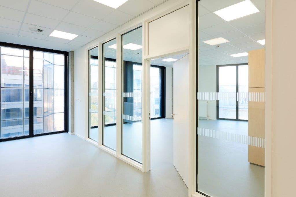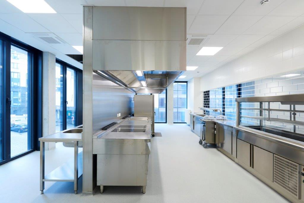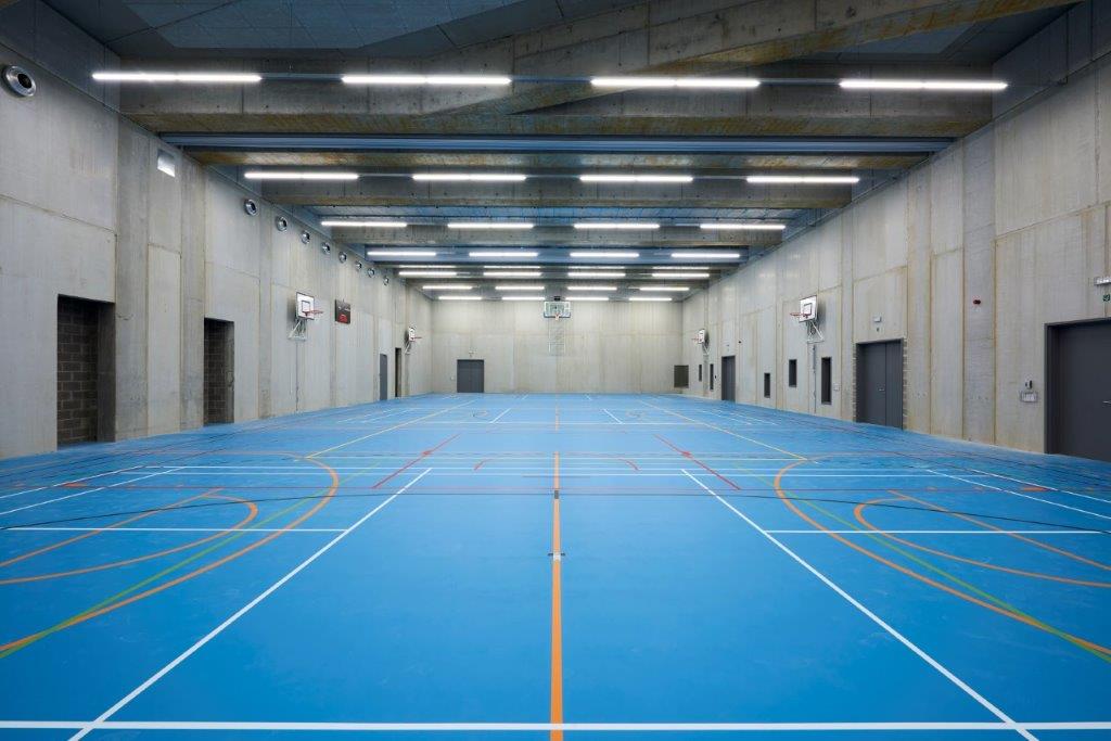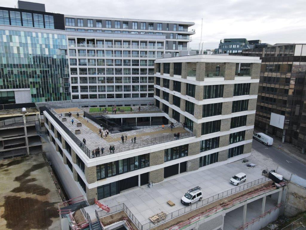 “Op esthetisch vlak is er geopteerd voor een herkenbare en homogene architectuurtaal, al zijn er qua kleur en materiaalgebruik wel enkele nuances aangebracht om het geheel te onderscheiden van de andere volumes op de site”, legt Marc De Greef uit. “De groengrijze gevelsteen en tussenliggende horizontale stroken in wit architectonisch beton geven de school een gracieuze uitstraling, zeker in combinatie met de verdiepingshoge ramen. Ook op technisch en energetisch vlak is het een vooruitstrevend project, waarbij zonnepanelen en WKK-installaties de nodige groene energie produceren. Deze laatste zijn al in het begin van de ruwbouwfase in de ondergrondse technische ruimtes geplaatst, aangezien we ze anders niet meer op hun plek zouden krijgen. De studie van de speciale technieken moest dus al in een erg vroeg stadium uitgevoerd worden. Vermits de school zich tegenover een appartementsgebouw bevindt, zijn de ventilatiegroepen niet op het dak geplaatst, maar eveneens op de ondergrondse verdiepingen.”