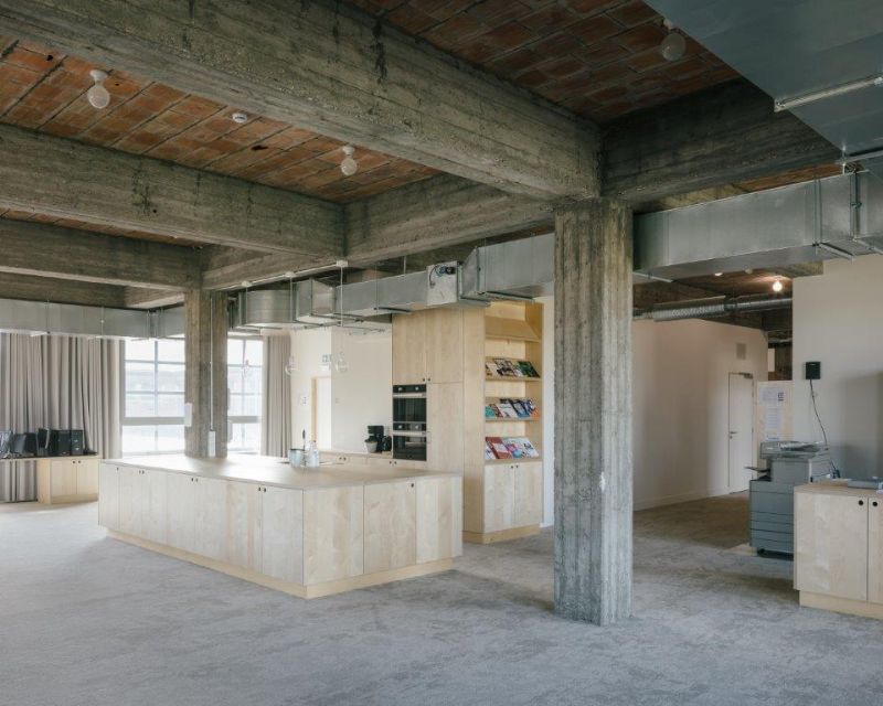 De kwalitatieve, open structuur van het vestiairegebouw leende zich perfect tot de realisatie van eigentijdse, moderne onderwijsinfrastructuur, die is opgevat als een brede leer- en leefomgeving. “We hebben de sfeer en de materialiteit van het gebouw maximaal proberen te bewaren”, vertelt Stefaan Evers, architect-vennoot bij a2o-architecten, dat de krachten bundelde met AAC Architecture. “De buitenschil was al gerestaureerd voor dit project vorm kreeg, dus daar hebben we op zich niets aan veranderd. En aangezien de bestaande betonstructuur nog in goede staat was, hebben we hem dankbaar gebruikt als uitgangspunt voor de realisatie van het nieuwe programma en hebben we hem zo zuiver mogelijk proberen te tonen. De enige grote structurele ingreep was de creatie van drie ruime vides, waarin we ook een aantal nieuwe trappen geplaatst hebben.”