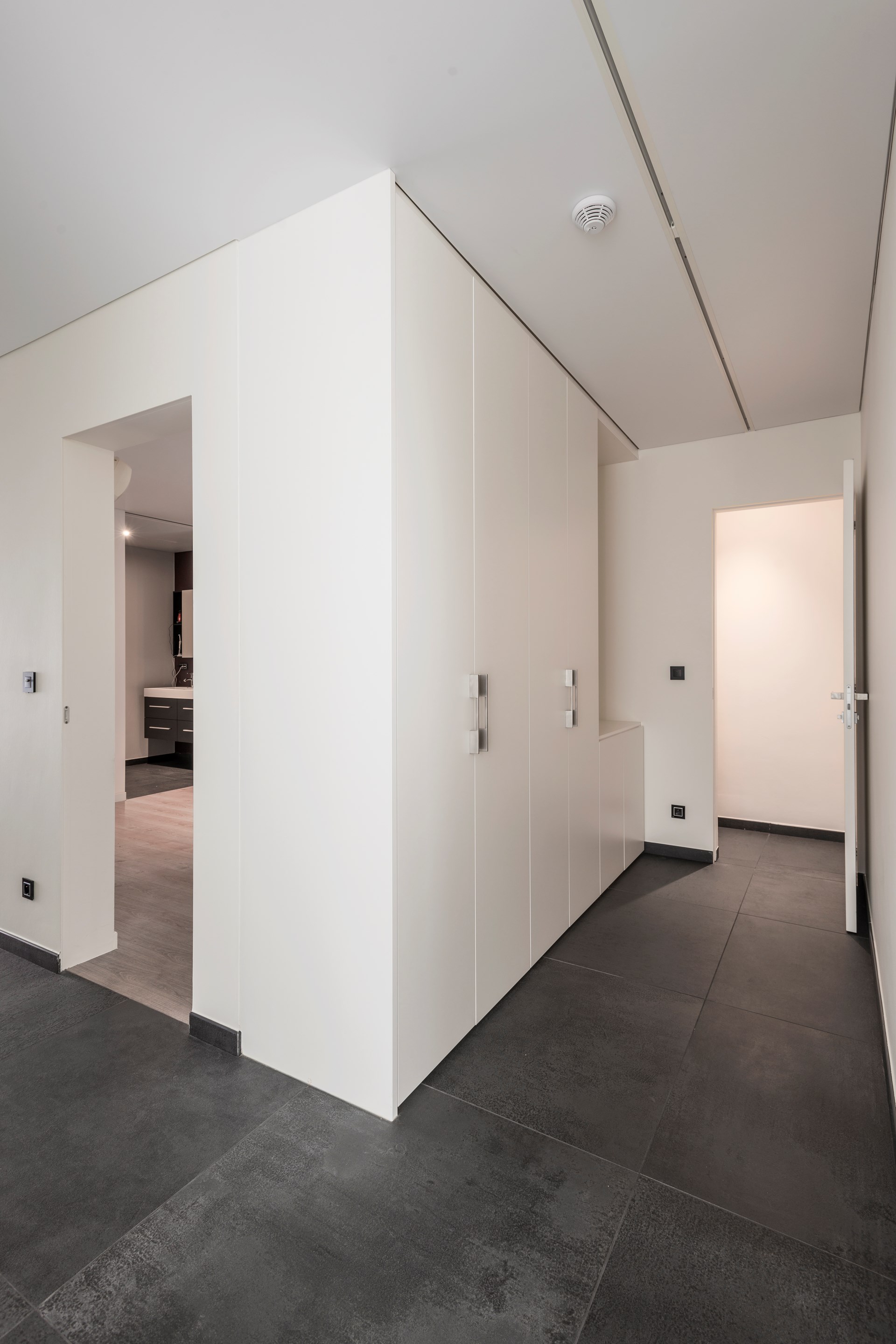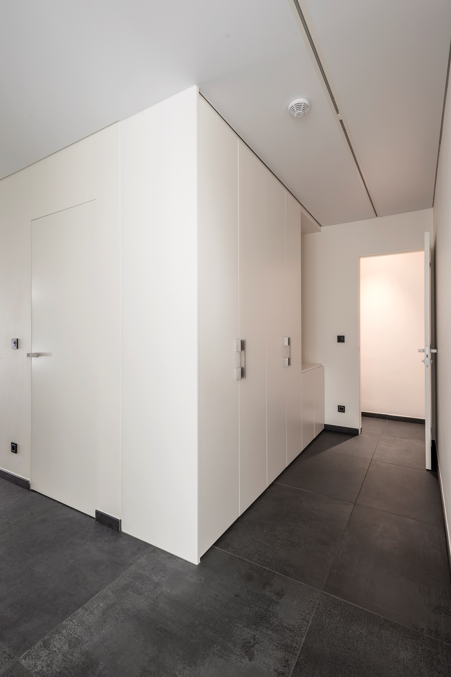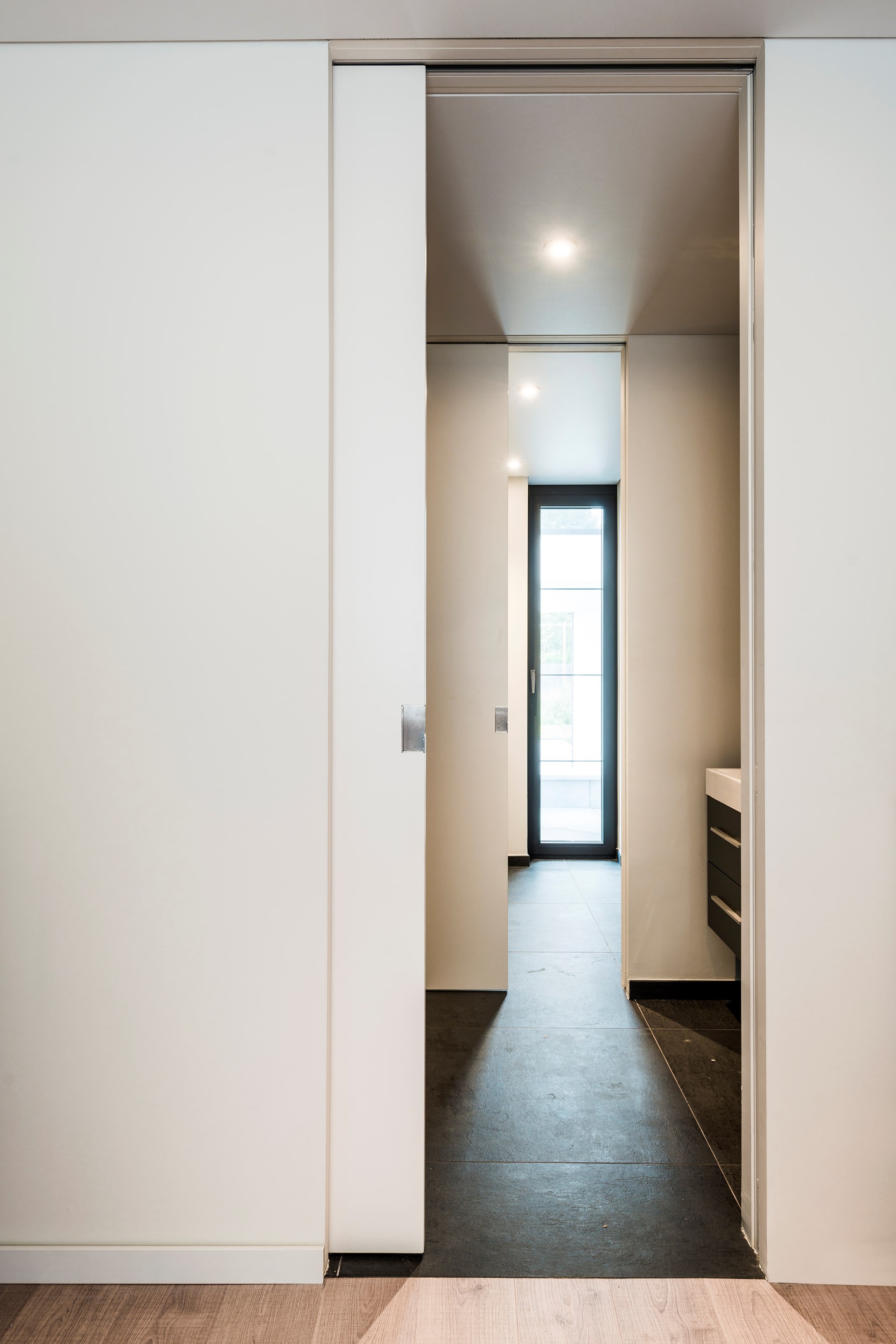 Ook het aluminium deurkader van elk van de 7 kamerhoog uitgevoerde argenta invisidoor SDX schuifdeuren werd onzichtbaar in de wand geïntegreerd. “Zo blijft er een wandopening achter, eerder dan een deuropening,” licht de architect zijn keuze toe voor de schuifdeuren die bij het openen volledig in de wand verdwijnen.