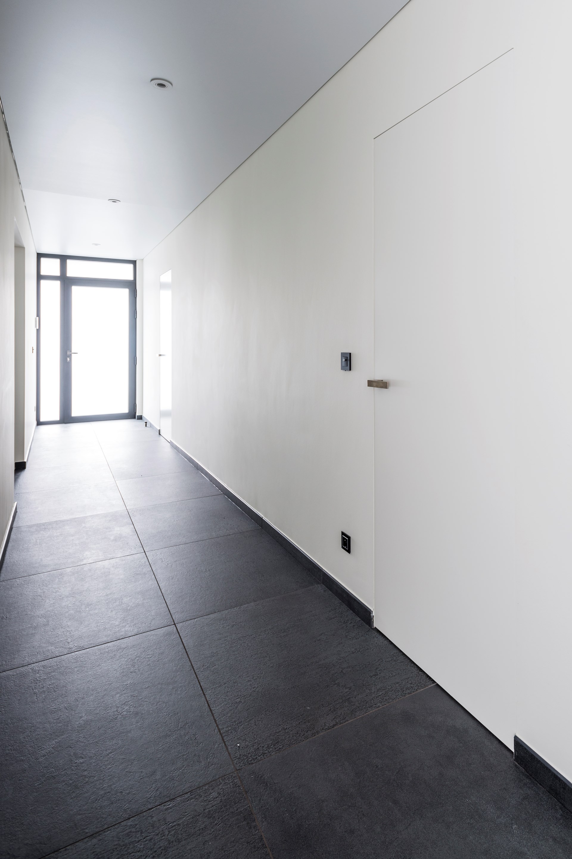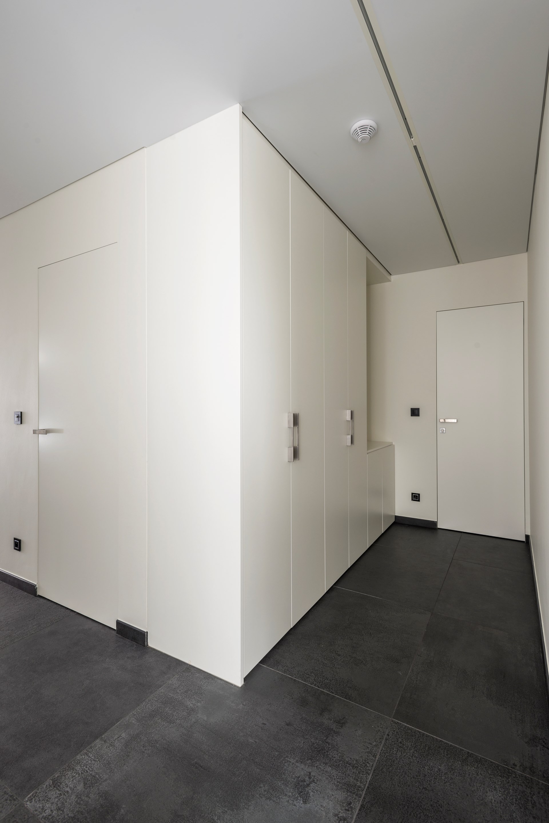 De geometrie van die volumes speelt daarbij een grote rol en getuigt op z’n zachtst uitgedrukt van een super strakke vormgeving waarbij ramen zijn opgevat als kamerbrede en kamerhoge glaspartijen, terwijl de wanden hoofdzakelijk volle vlakken zijn. De keuze voor binnendeuren zonder zichtbare technieken was dan ook een logische.