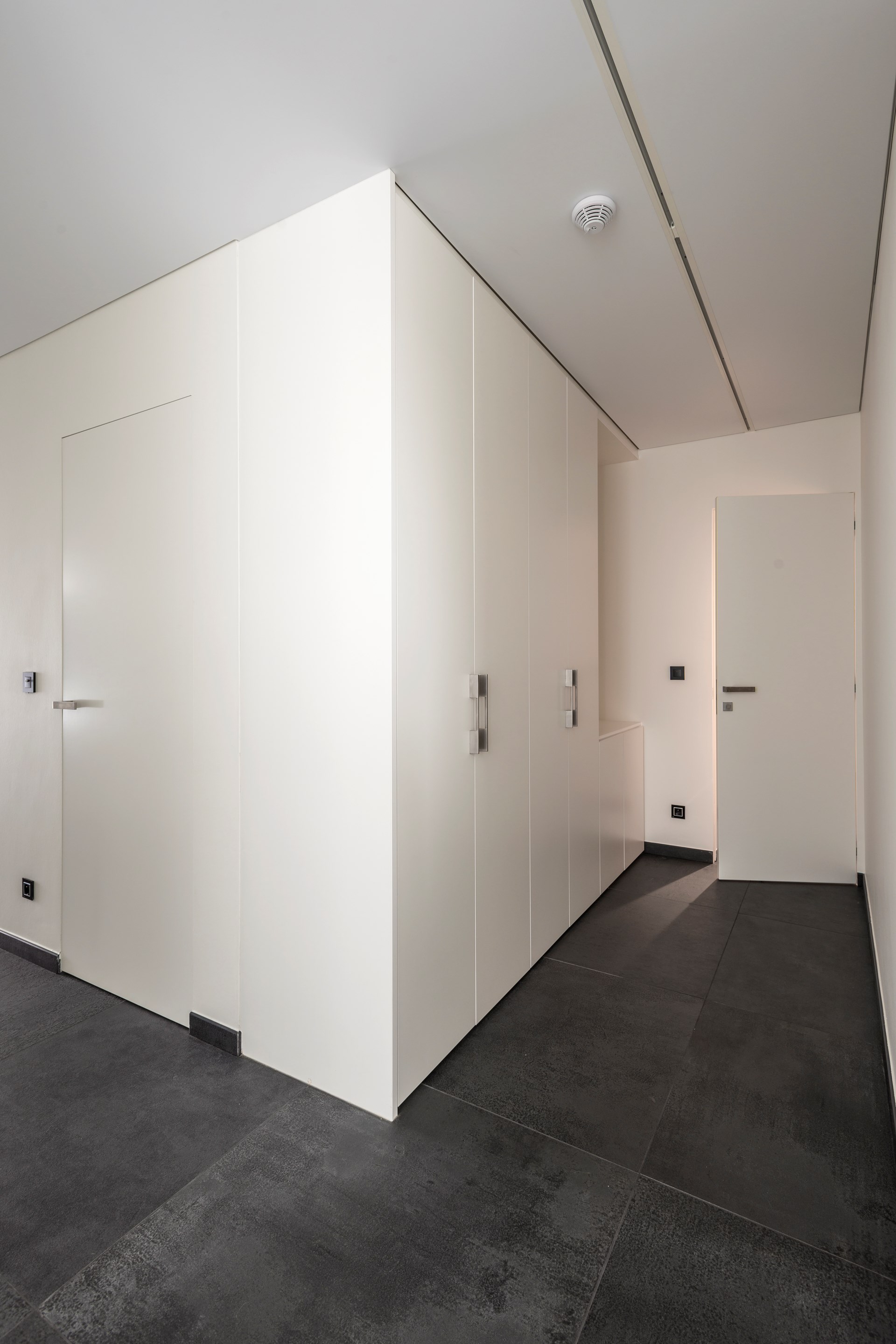 “Net omdat die als het ware deel uitmaken van de binnenwanden, passen de argenta invisidoor deursystemen perfect in dit concept. De Invisidoor DL draaideuren (23 enkele en 2 dubbele in totaal) liggen in hetzelfde vlak als de muur, onafhankelijk van de draairichting van de deur. Door de deuren in dezelfde kleur als de wanden af te werken, vallen die zelfs nog minder op”, aldus architect Danny Plaetinck. Net als het aluminium deurkader zijn trouwens ook de argenta invisible neo scharnieren onzichtbaar ingewerkt.
