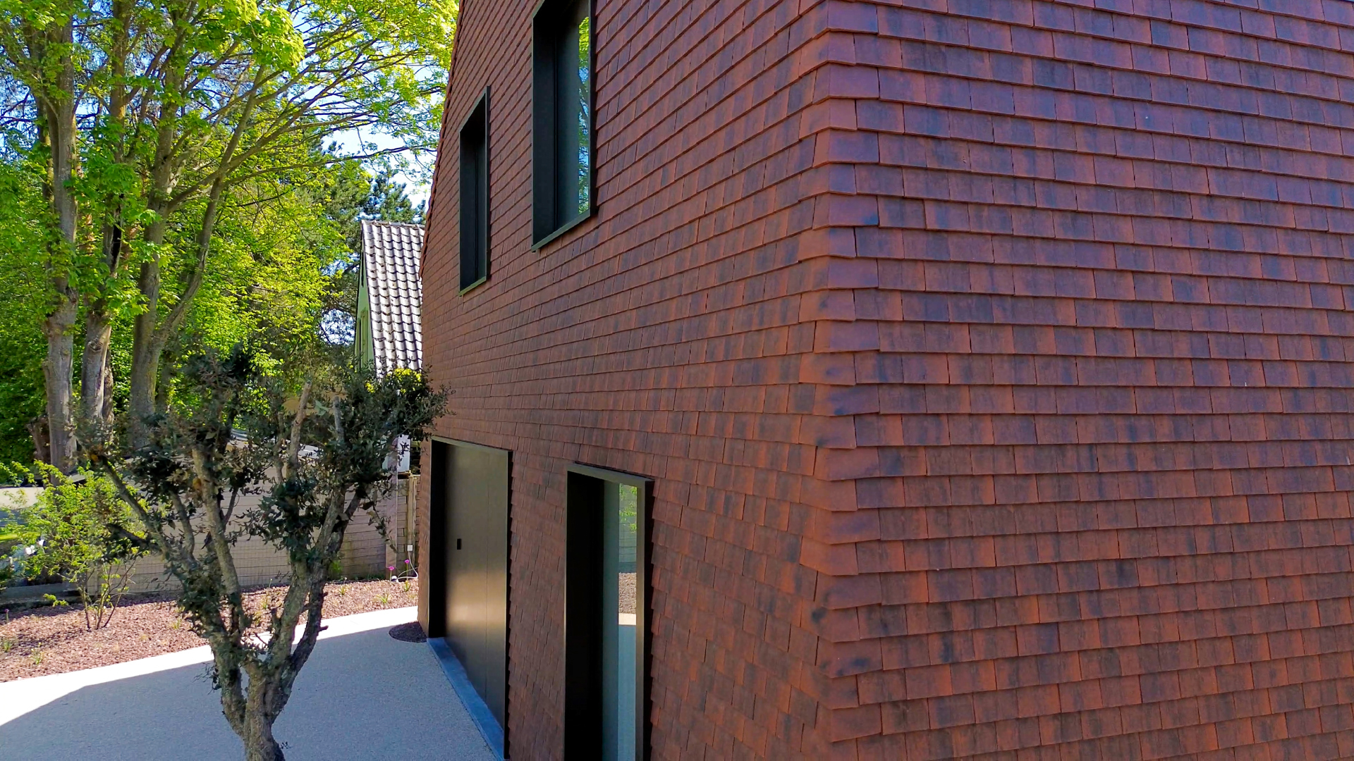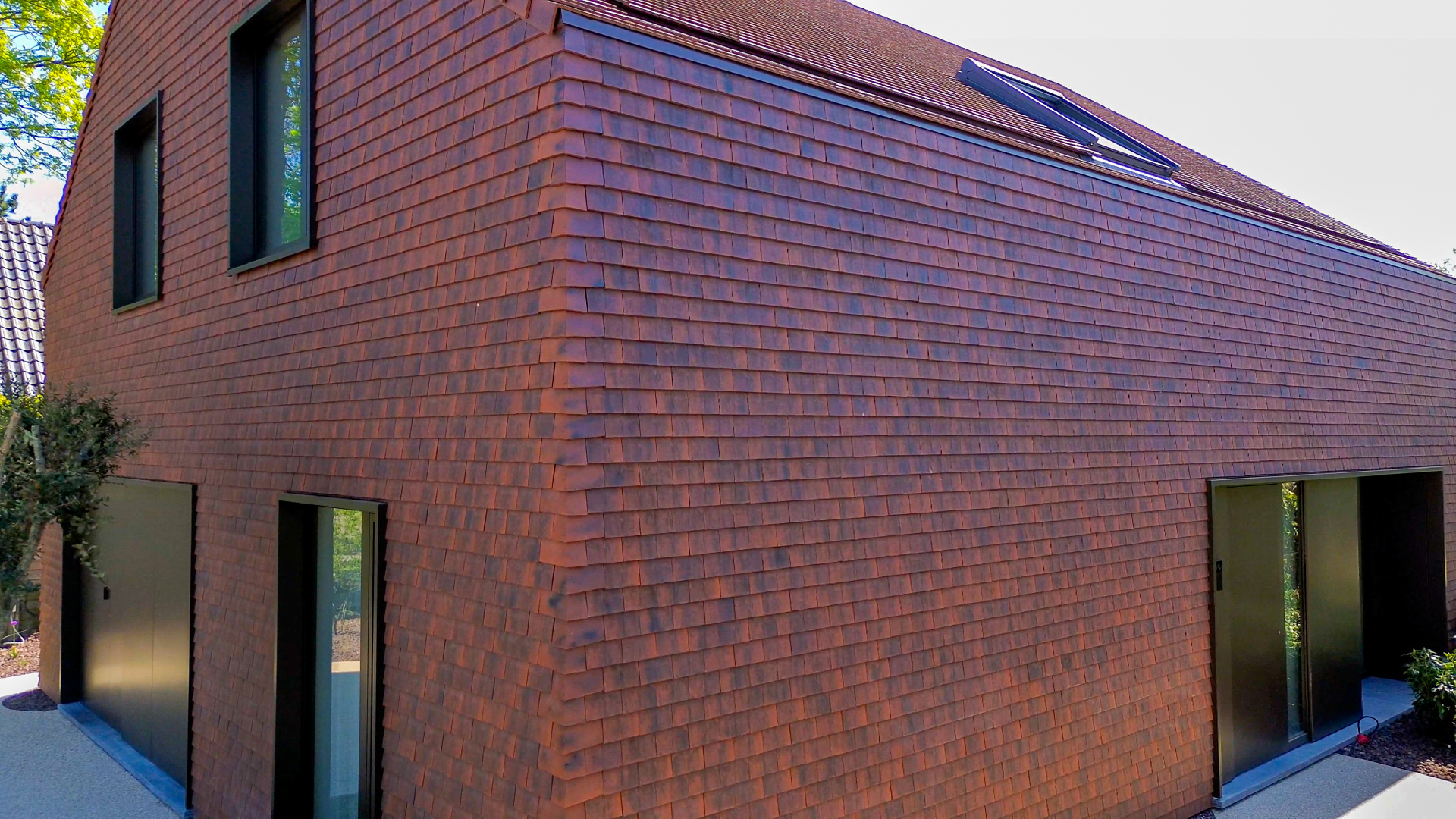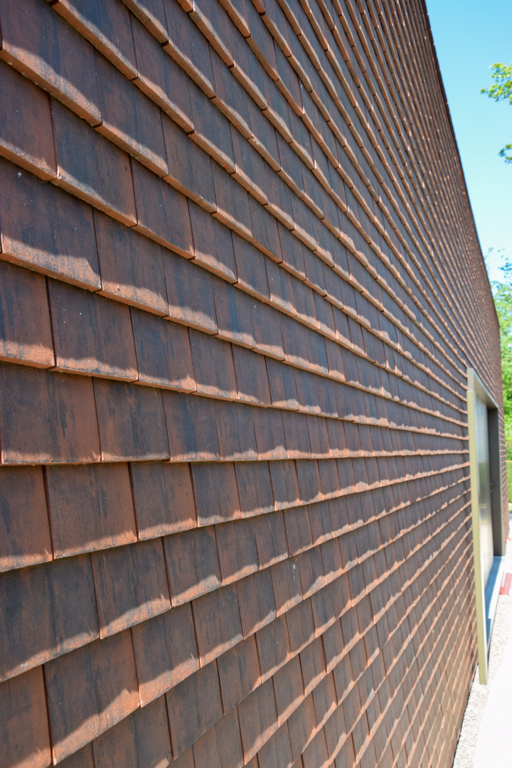 Niene: “In totaal werden meer dan 22.000 kleitegelpannen verwerkt. Omdat het om kleine pannen gaat die met overlap geplaatst worden, was een degelijk lattenwerk op de gevel noodzakelijk. Daarachter bevinden zich een geventileerde spouw, onderdakfolie en isolatie.” Ondanks de omvang verliep de uitvoering opvallend vlot: in amper drie weken waren zowel dak als gevel volledig afgewerkt. Dat kwam onder meer door de eenvoudige verwerking van de pan en de goede ondersteuning van CREATON TERREAL.