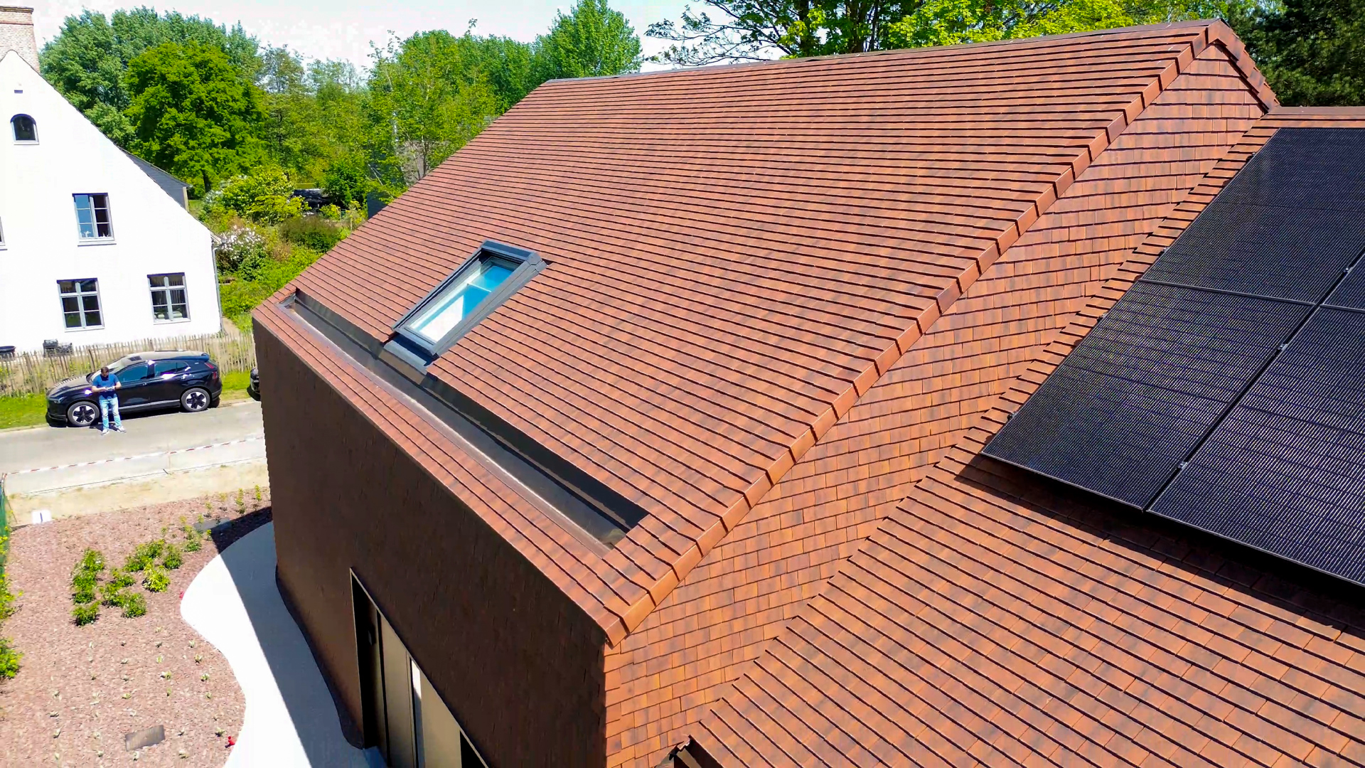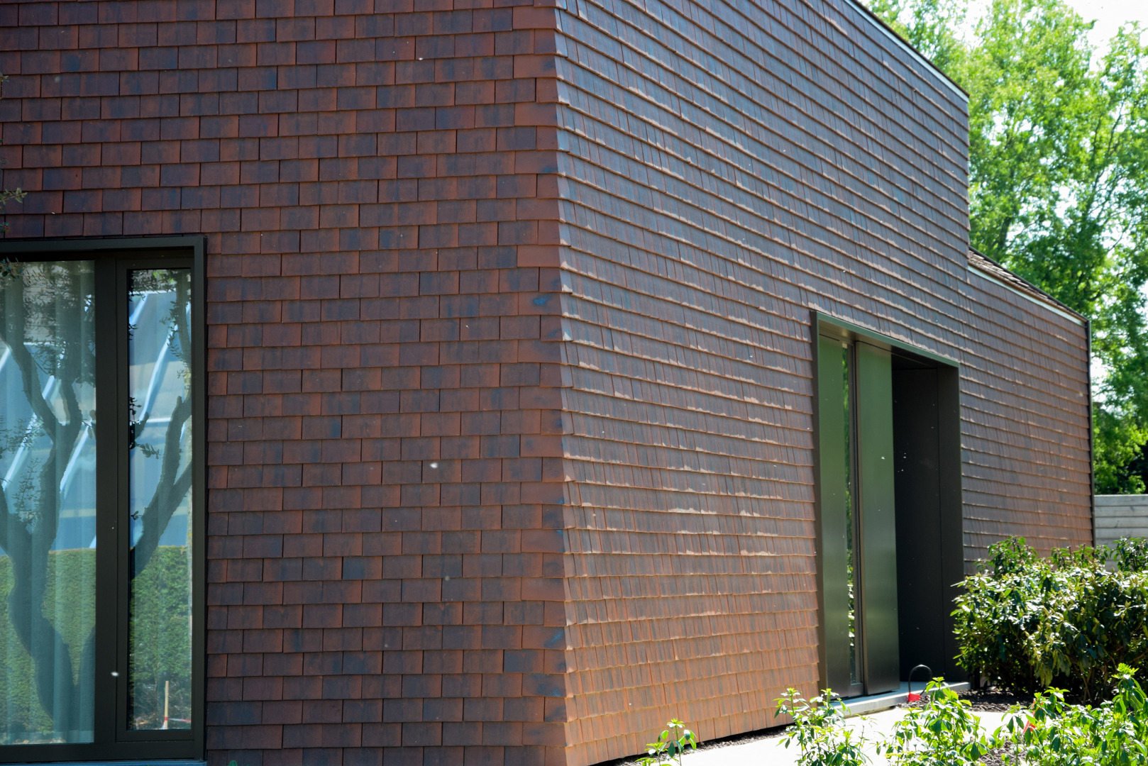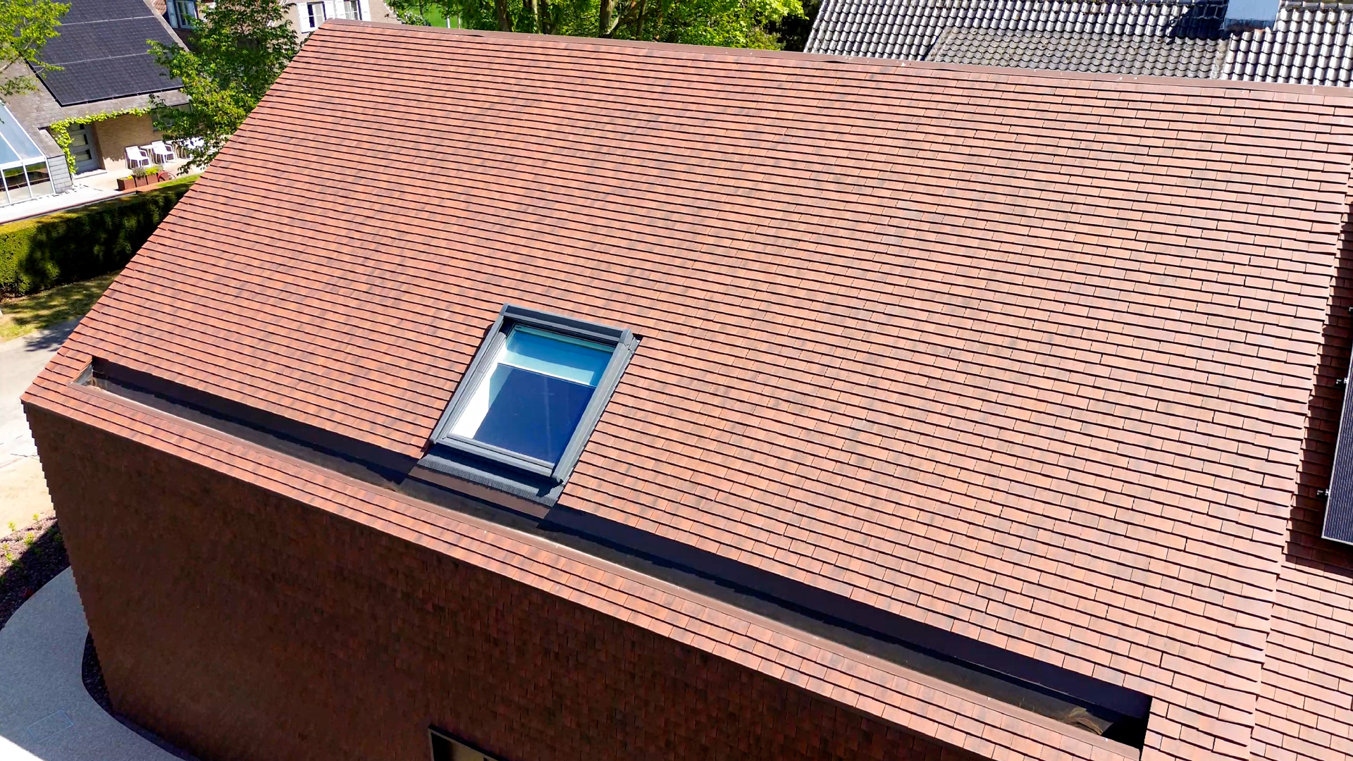 Niene: “In totaal werden meer dan 22.000 kleitegelpannen verwerkt. Omdat het om kleine pannen gaat die met overlap geplaatst worden, was een degelijk lattenwerk op de gevel noodzakelijk. Daarachter bevinden zich een geventileerde spouw, onderdakfolie en isolatie.” Ondanks de omvang verliep de uitvoering opvallend vlot: in amper drie weken waren zowel dak als gevel volledig afgewerkt. Dat kwam onder meer door de eenvoudige verwerking van de pan en de goede ondersteuning van CREATON TERREAL.