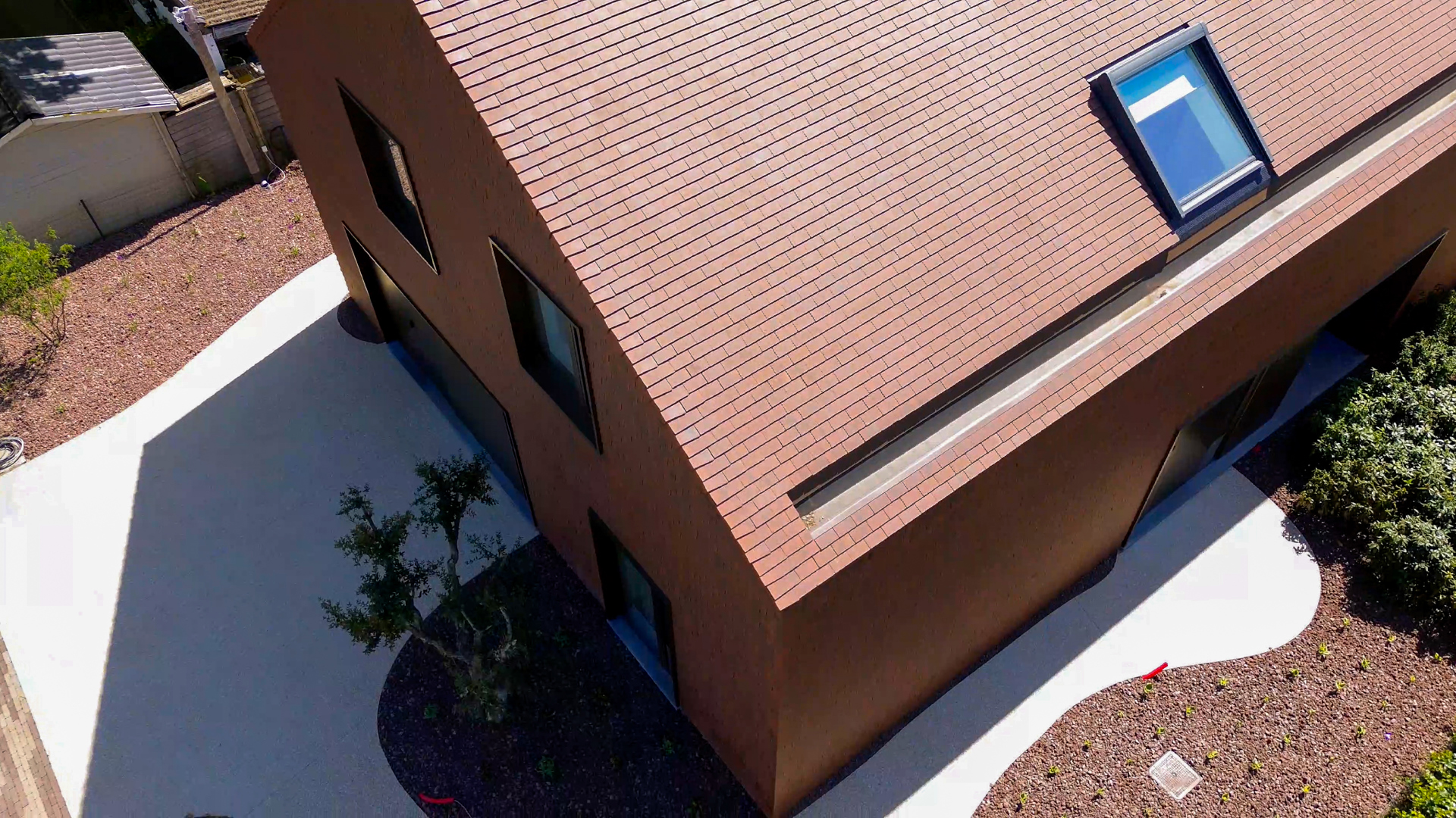 De woning valt op door verfijnde afwerkingen en slimme oplossingen. Raam- en deuropeningen zijn uitgewerkt met kokerprofielen, waarbij de aansluiting met de pannen zorgvuldig werd bestudeerd. Verborgen goten versterken het strakke lijnenspel, en zinken afwerkprofielen in Pigmento Brown van VMZINC sluiten esthetisch perfect aan bij de panbekleding. Ook de hoeken van de woning zijn opvallend strak uitgewerkt: speciale hoekpannen liggen in hetzelfde vlak als de gevelpannen, waardoor de woning een robuust, monolithisch karakter krijgt.