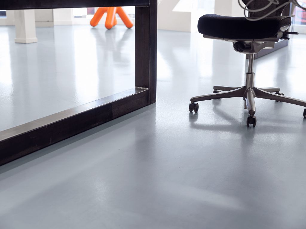 De kleur werd Worked Metal. Een levendige betonlook in lichtgrijs. Susanne: "Een supermatch met de zwarte metalen poten van onze meubels. En met de houten tafelbladen en de groeiende plantenjungle hier. Samen met de dempende plafondplaten is de akoestiek ook top. Niet onbelangrijk in een grote ruimte met dertig workaholics."
