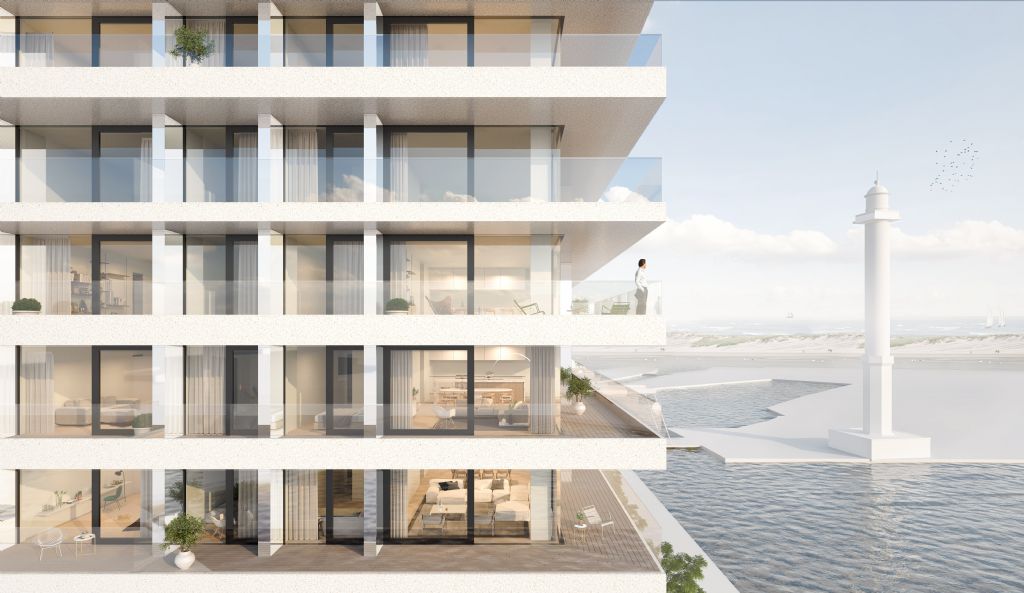 Alle appartementen zijn voorzien van een ruim terras, met een strak aanzicht en een glazen balustrade. De zwevende terrasboorden uit wit beton creëren heldere woonlagen en wekken de indruk van op elkaar gestapelde tafels. Het buitenschrijnwerk is zwart en de bijzondere spiegelscheidingen tussen de appartementen geven het geheel een karaktervol, tijdloos en licht uiterlijk.