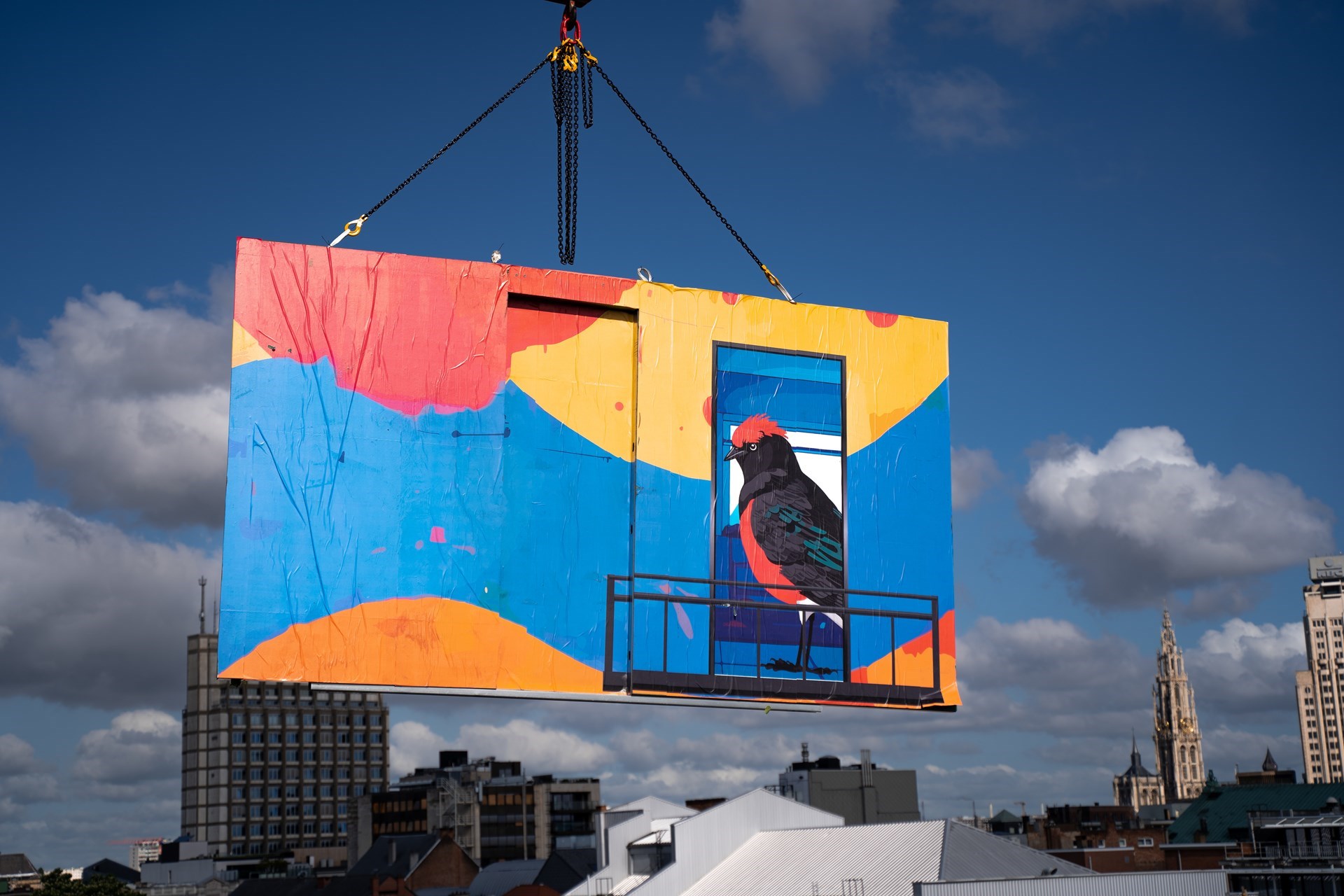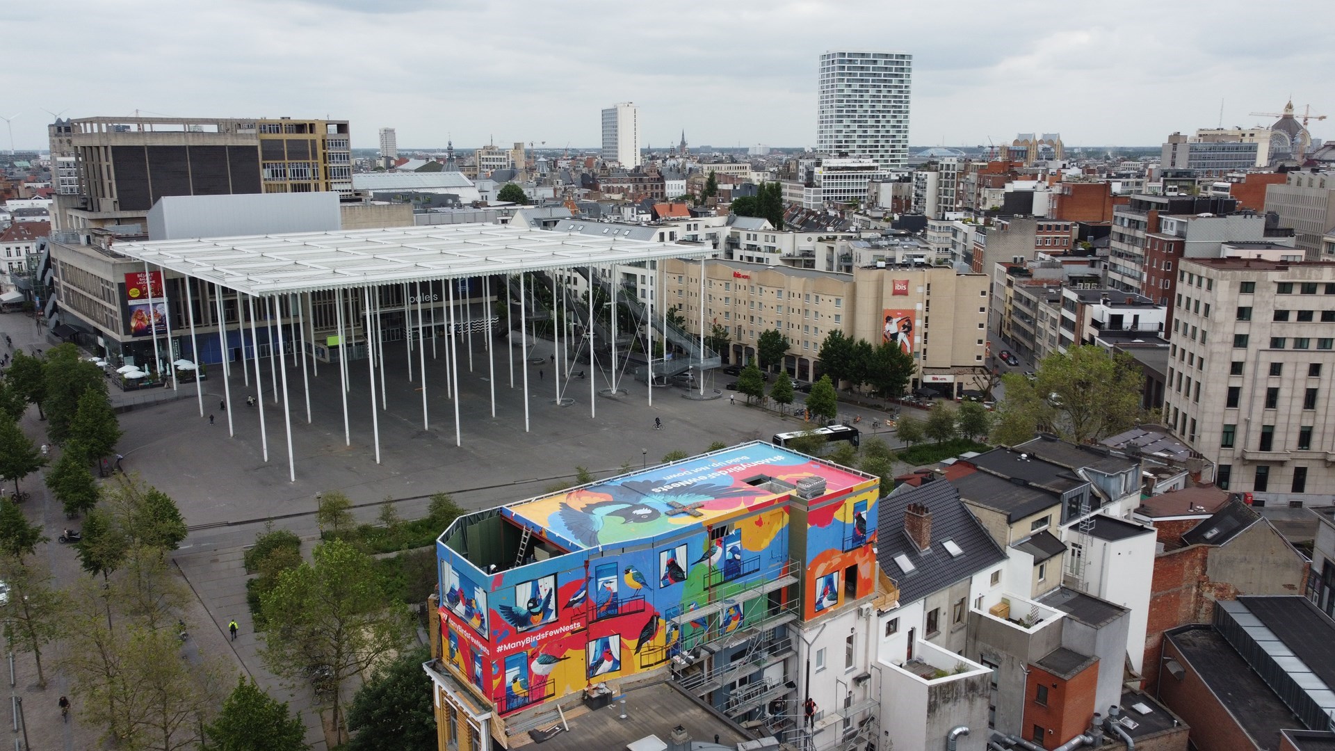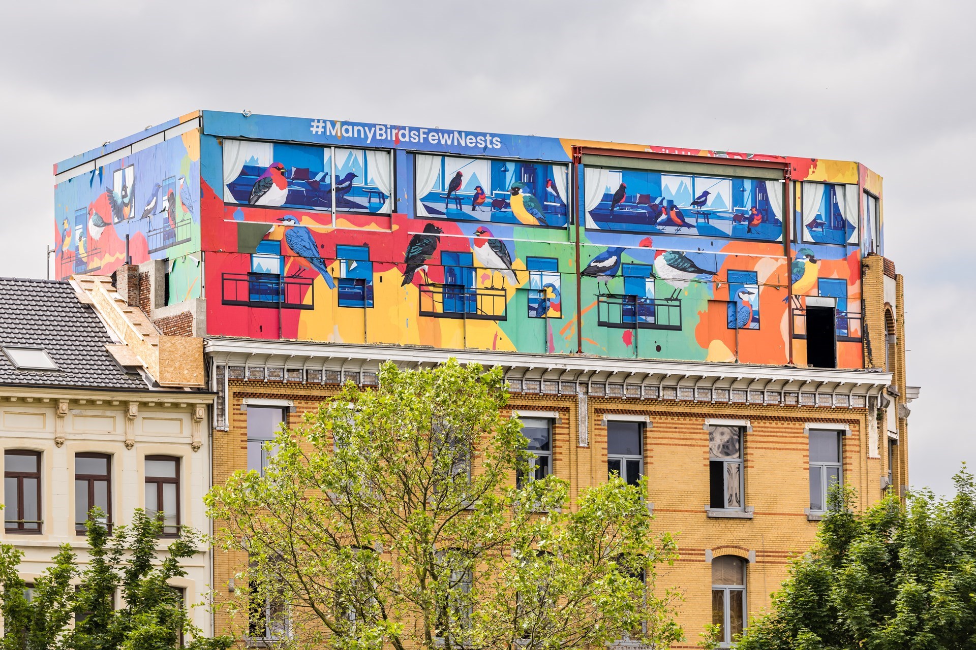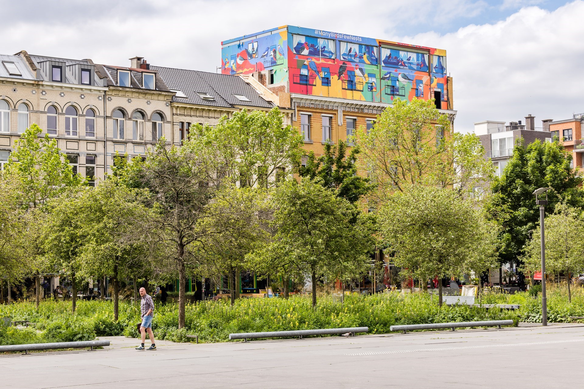 Wie over de Antwerpse Vogeltjesmarkt wandelt, kan er niet naast kijken: het gebouw op de hoek van het Theaterplein en de Oudevaartplaats kreeg een indrukwekkende, kleurrijke extra verdieping. Door deze te hullen in een opvallend street art jasje, met symbolische boodschap en knipoog naar de natuur en het plein waar het gelegen is, wil bouwpionier BuildUp mensen bewust maken van alternatieve duurzame bouwoplossingen voor het woningtekort.