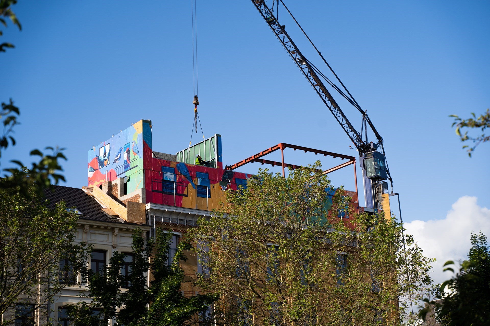 Het team van BuildUp werkte voor het Antwerpse project samen met architect Roel Vermeesch van architectenbureau KAP 32 uit Broechem. Er komen twee nieuwe verdiepingen bovenop de bestaande structuur van het gebouw op de hoek van het Theaterplein en de Oudevaartplaats. De montage startte begin mei en werd vandaag gefinaliseerd. Om er een echte eyecatcher van te maken, steekt de stalen constructie nog even in een kleurrijk streetart jasje van grafisch designer Davi Giolo.