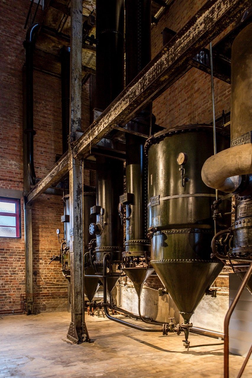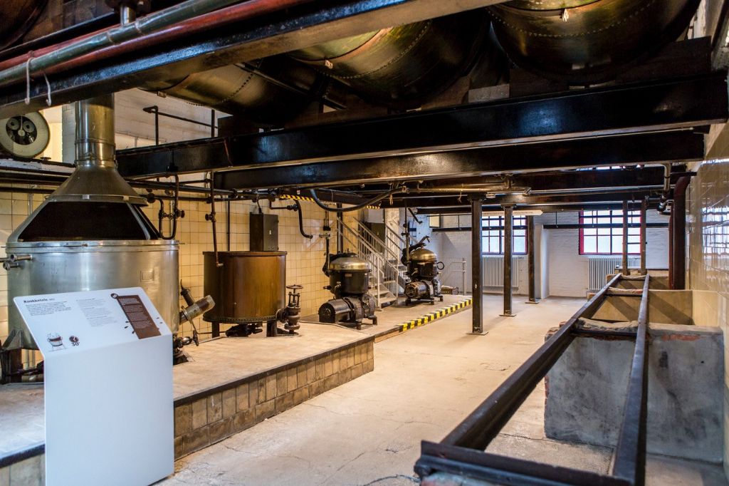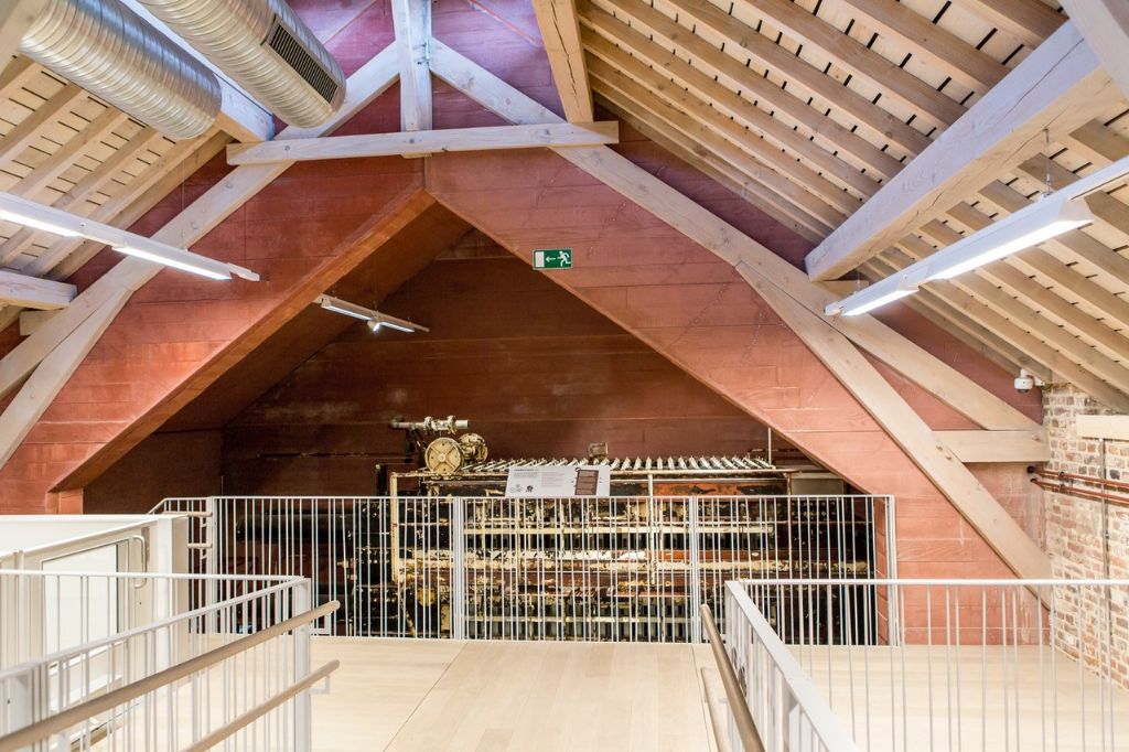 Rondgang langs de industriële machines op de verdieping in het historisch gebouw