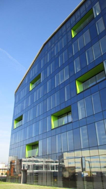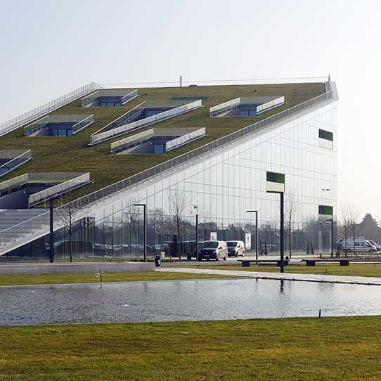 Een ander opvallend aspect is de transparante gordijngevel, die het gebouw een zeer strak uiterlijk geeft. “We wilden de overgang tussen groendak en gebouw zo zacht mogelijk houden en hebben daarom geopteerd voor een quasi volledig beglaasde gevel. Het was zoeken naar een balans tussen de vooropgestelde transparantie en de thermisch-energetische eisen. We hebben geopteerd voor hoogkwalitatieve beglazing die enerzijds voldoende licht binnenlaat, maar anderzijds ook oververhitting verhindert. Om een zo clean en uniform mogelijk uiterlijk te bekomen hebben we op de ‘vaste’ elementen, die van binnenuit zichtbaar zijn als muren, een speciale coating aangebracht. Deze zorgt voor een gelijkaardige kleurbeleving en reflectie als de ‘lichtdoorlatende’ elementen.”