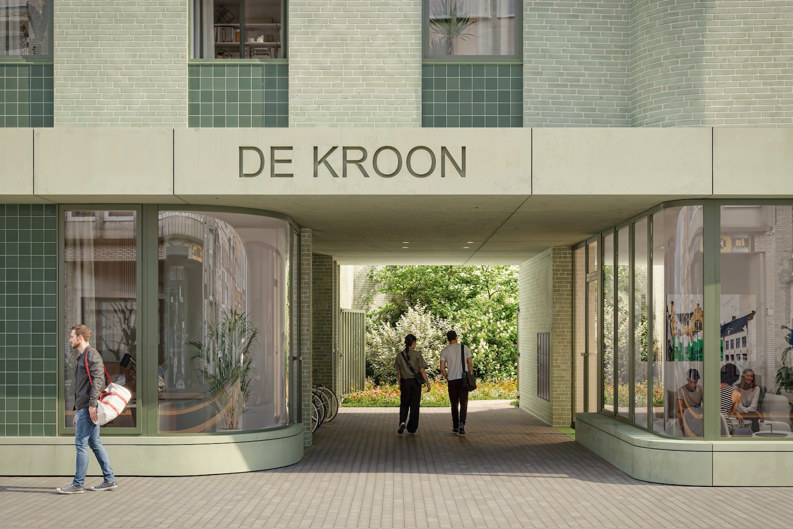 Een uitgesneden doorgang midden in het volume maakt de achterliggende binnentuin rechtstreeks bereikbaar vanaf de straat. Deze centrale onderdoorgang wordt aan de ene kant geflankeerd door een fietsenstalling, en aan de andere zijde door een collectieve leefruimte. De inkom wordt extra geaccentueerd door een hoekverdraaiing in de gevel, wat niet alleen oriëntatie verscherpt maar ook een subtiel stedelijk gebaar maakt naar de voorbijganger. Dankzij deze ingrepen ontstaat er een open en uitnodigend karakter, eerder dan een gesloten bouwblok.