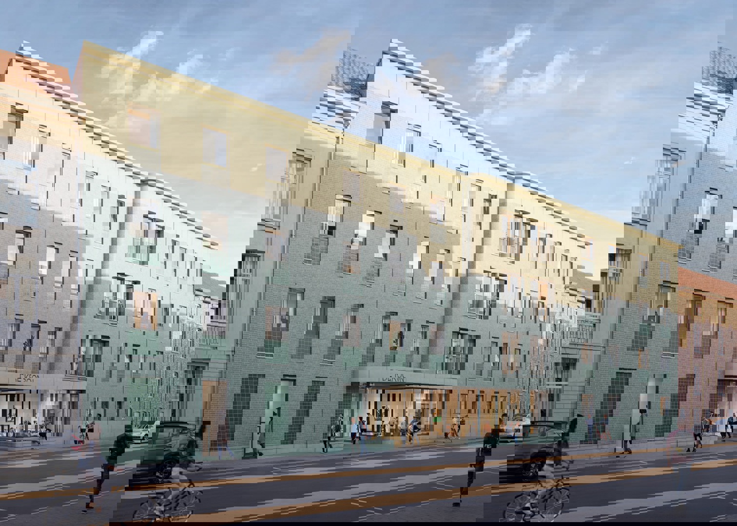 WE-S architecten ontwierp een gebouw dat zich gevoelig inschrijft in zijn context. De voorgevel is opgesplitst in vijf afzonderlijke traveeën, wat zorgt voor een morfologische dialoog met de aanpalende rijwoningen. Door een regelmatige rasterstructuur van ramen worden de studentenkamers aan de straatzijde subtiel gearticuleerd. Tegelijk wijzen grotere openingen op de centrale gemeenschappelijke ruimtes. De gevel zelf krijgt een afwerking in groengrijze genuanceerde baksteen, met speelse accenten in verzonken tegelvlakken en prefab betonelementen.