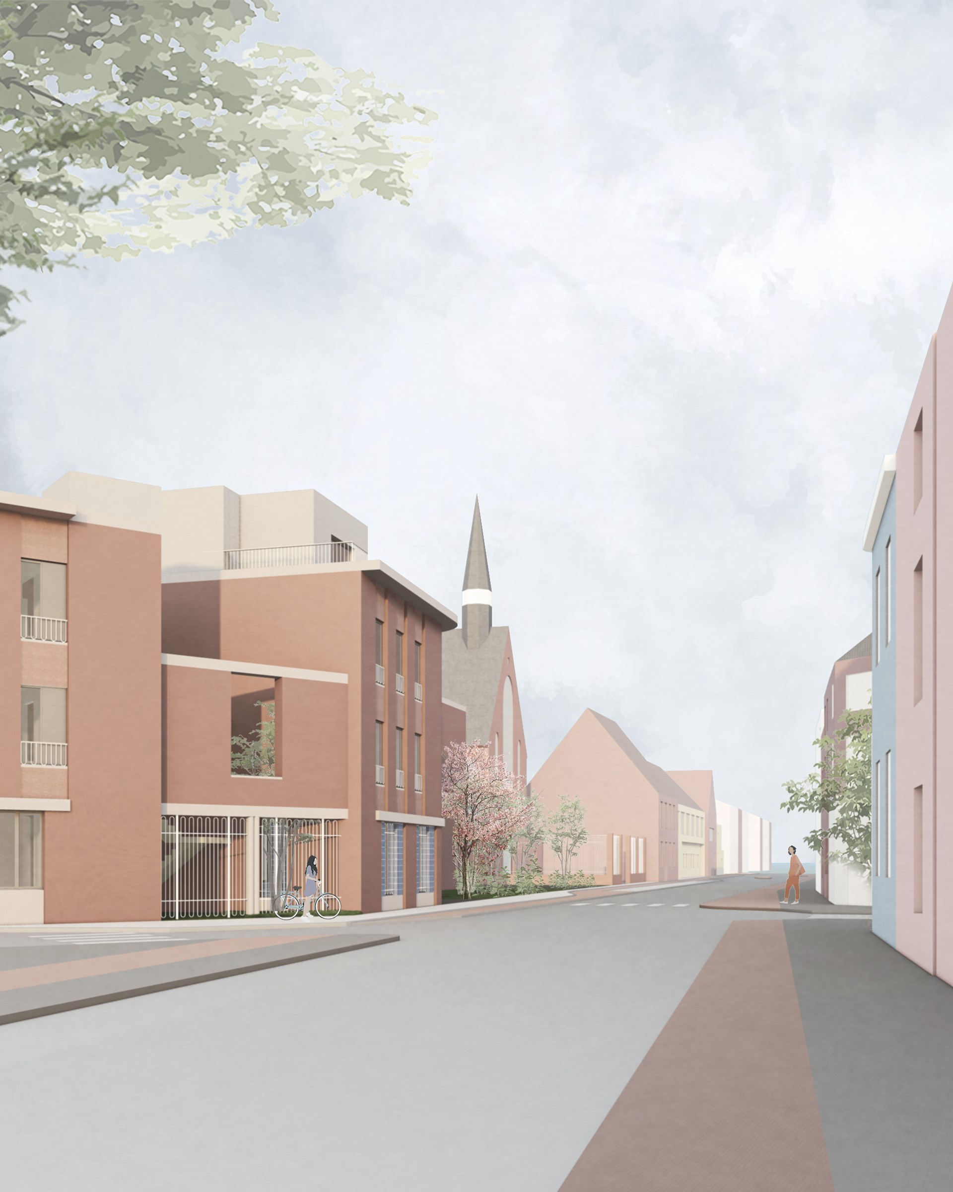 Studio Jan Vermeulen stelt een ensemble van 5 gebouwen en 5 open ruimtes voor die subtiel, bijna onzichtbaar, enkele psychologische barrières definiëren om zo het gevoel van veiligheid voor de bewoners te vergroten. Het is een ensemble van gebouwen dat ook nieuwe betekenisvolle relaties creëert met de bestaande kerk, de jongensschool en de kleinere naburige huizen.