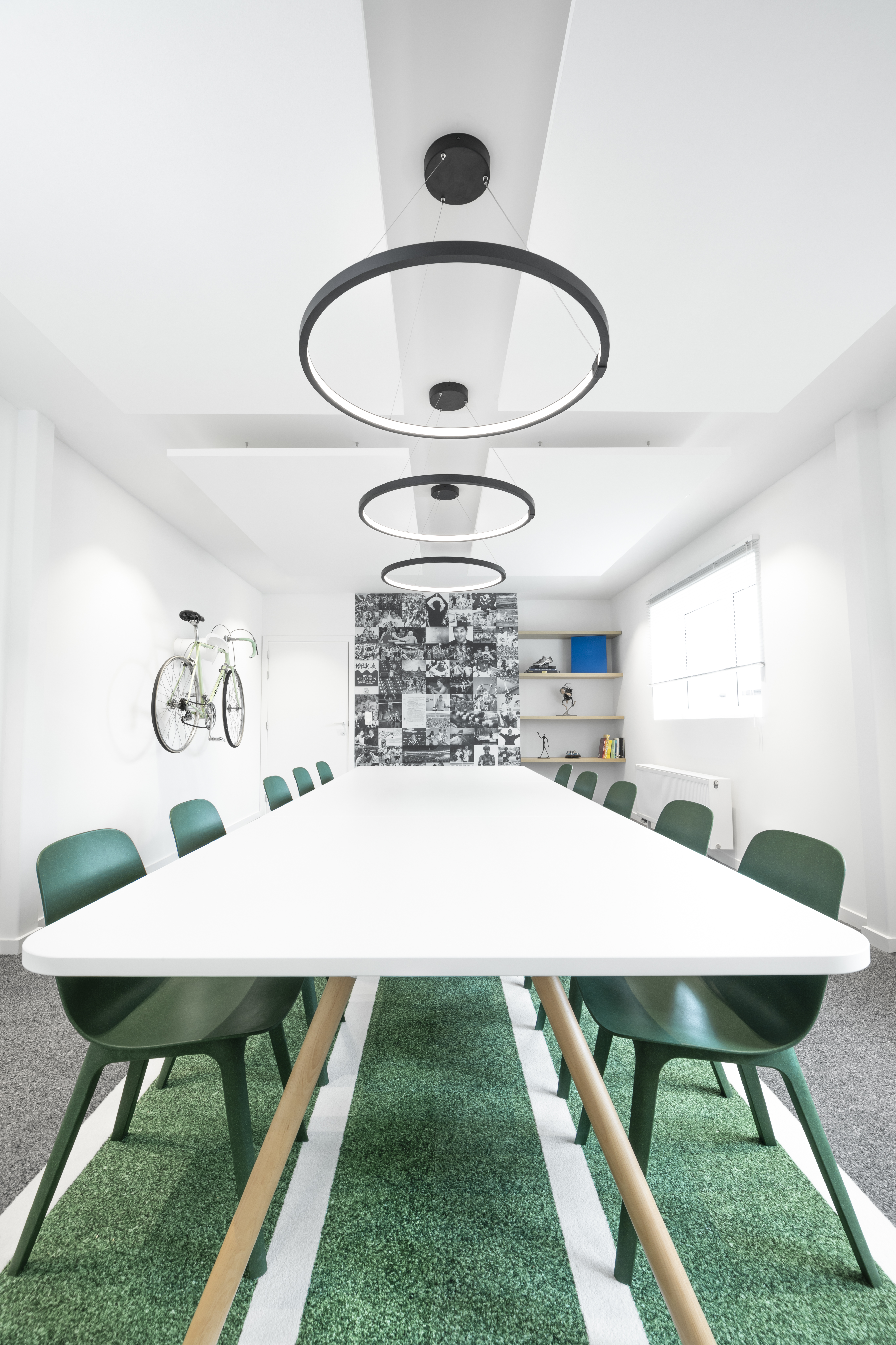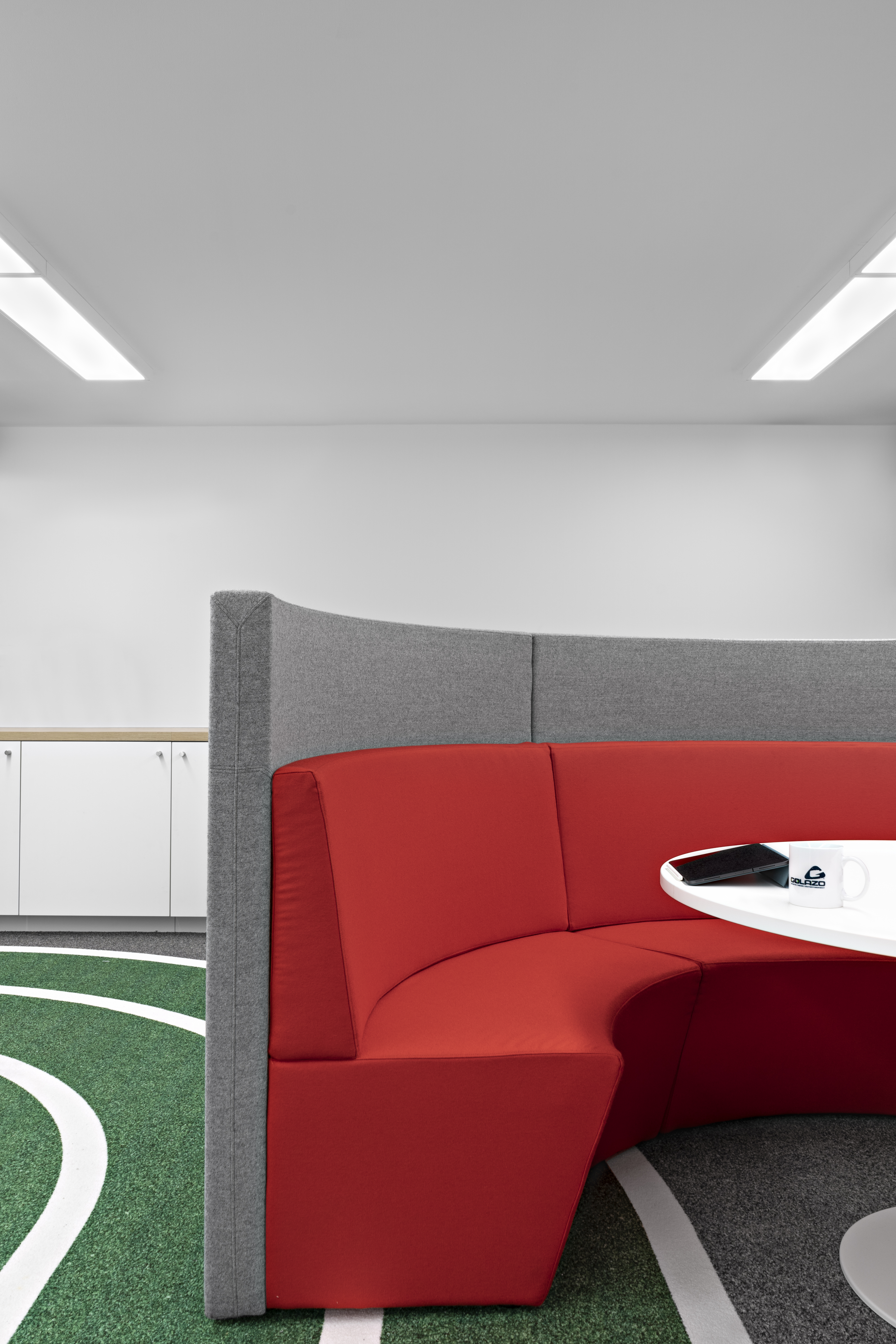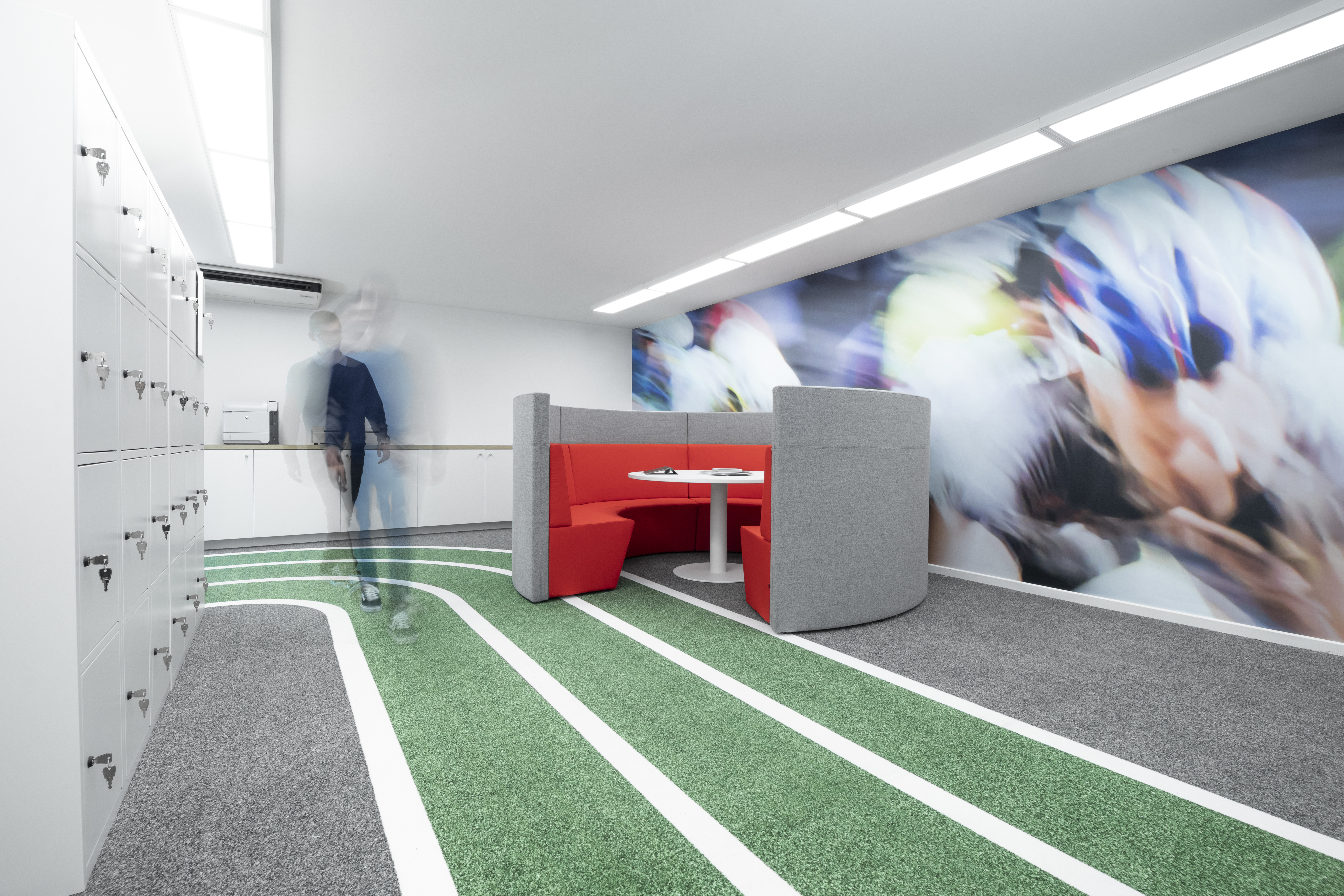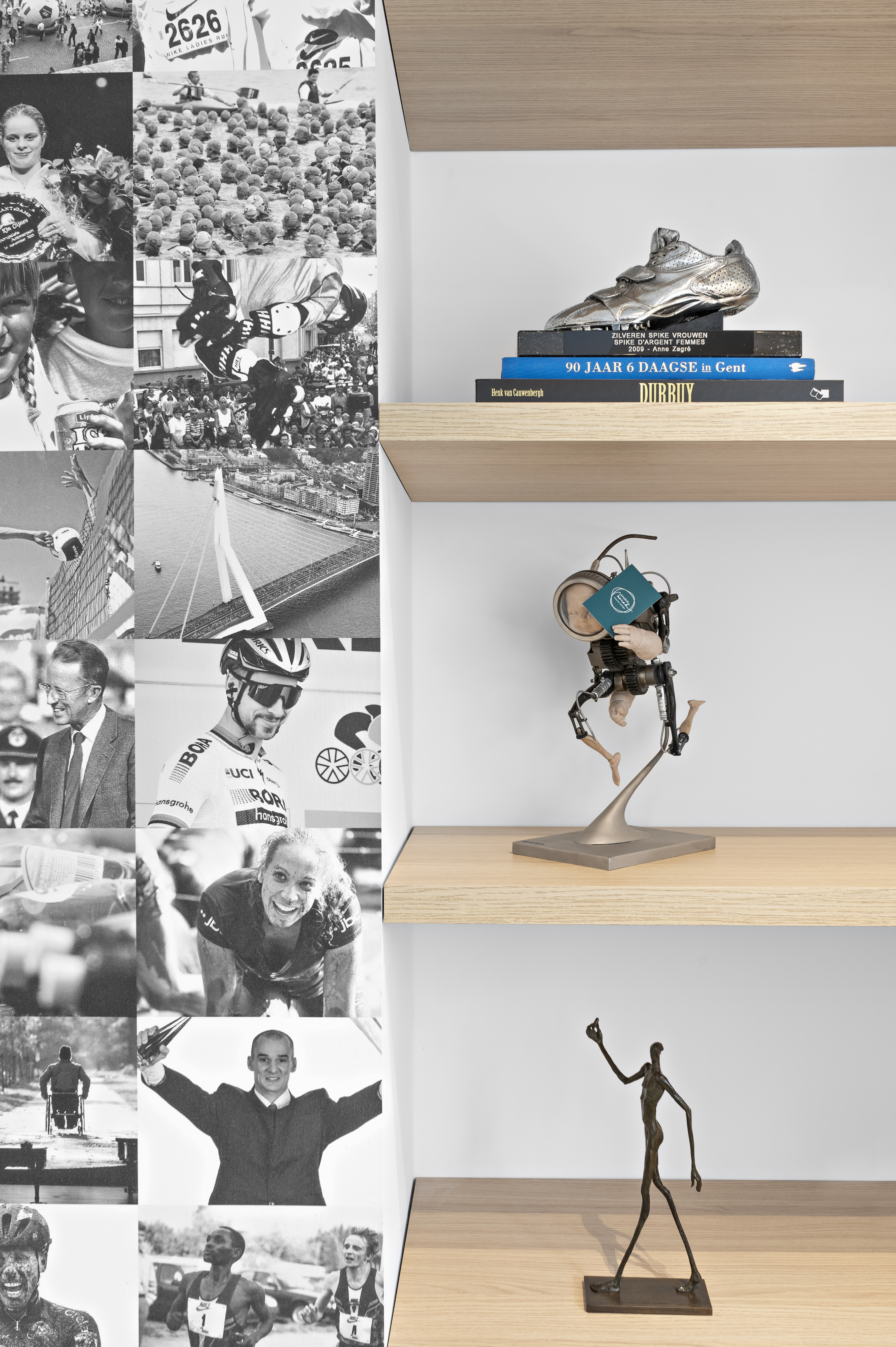 De belangrijkste eyecatcher in de vernieuwde kantoorruimte is het op maat gemaakte tapijt met groene looppiste die als rode draad doorheen de verschillende achter elkaar liggende ruimtes loopt, tot in de vergaderzaal. “Dit is natuurlijk een verwijzing naar de Memorial Van Damme, één van de vaandeldragers van Golazo”, klinkt het bij Studio Meraki. “Aan de inkom werden er lockers voorzien waar de eventmanagers hun persoonlijke spullen in kunnen opbergen. Deze doen wat denken aan de kleedkamers van een sportclub. Het originele vergadermeubel (de Ply van Drisag) in een ronde vorm, nodigt uit voor een efficiënte brainstormsessie of gezellig vergadermoment.”
