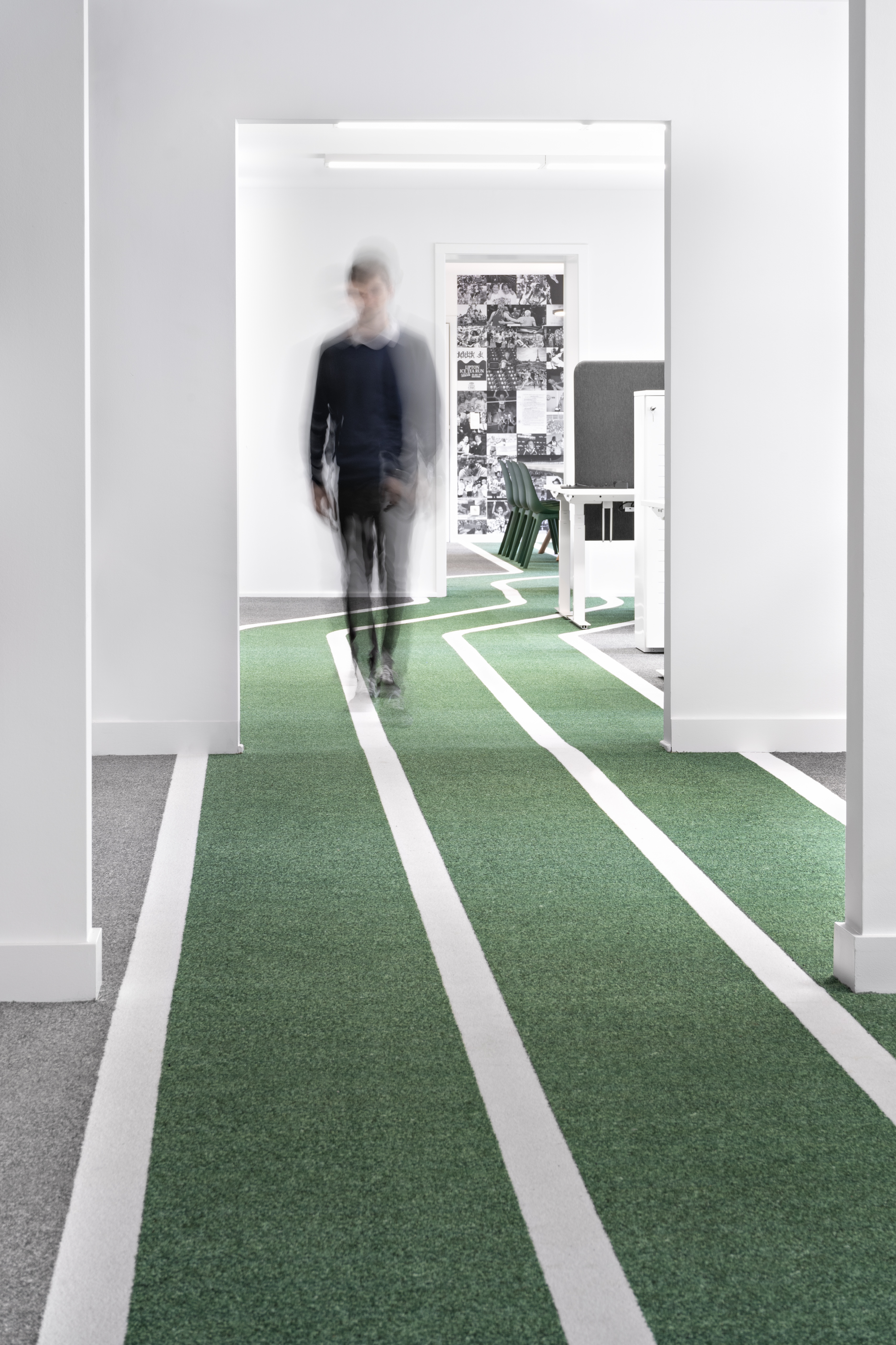 De structuur van de ruimte vormde voor Studio Meraki de grootste uitdaging. De bureaus van de event managers bestaan uit verschillende achter elkaar liggende ruimtes die op elkaar aansluiten in de vorm van een L. Studio Meraki: “Het was een uitdaging om hier één geheel van te maken. Dat lukte dankzij het tapijt dat één lange looppiste vormt tussen de ingang en de eindmuur in de vergaderzaal. Het doortrekken van de visual op de muur bracht niet alleen eenheid, maar ook rust. Door met een sobere basis te werken - grijs-groen tapijt, hoofdzakelijk witte muren en een eenvoudige indeling - konden we van de aparte, eerder donkere ruimtes, één groot, licht geheel maken.