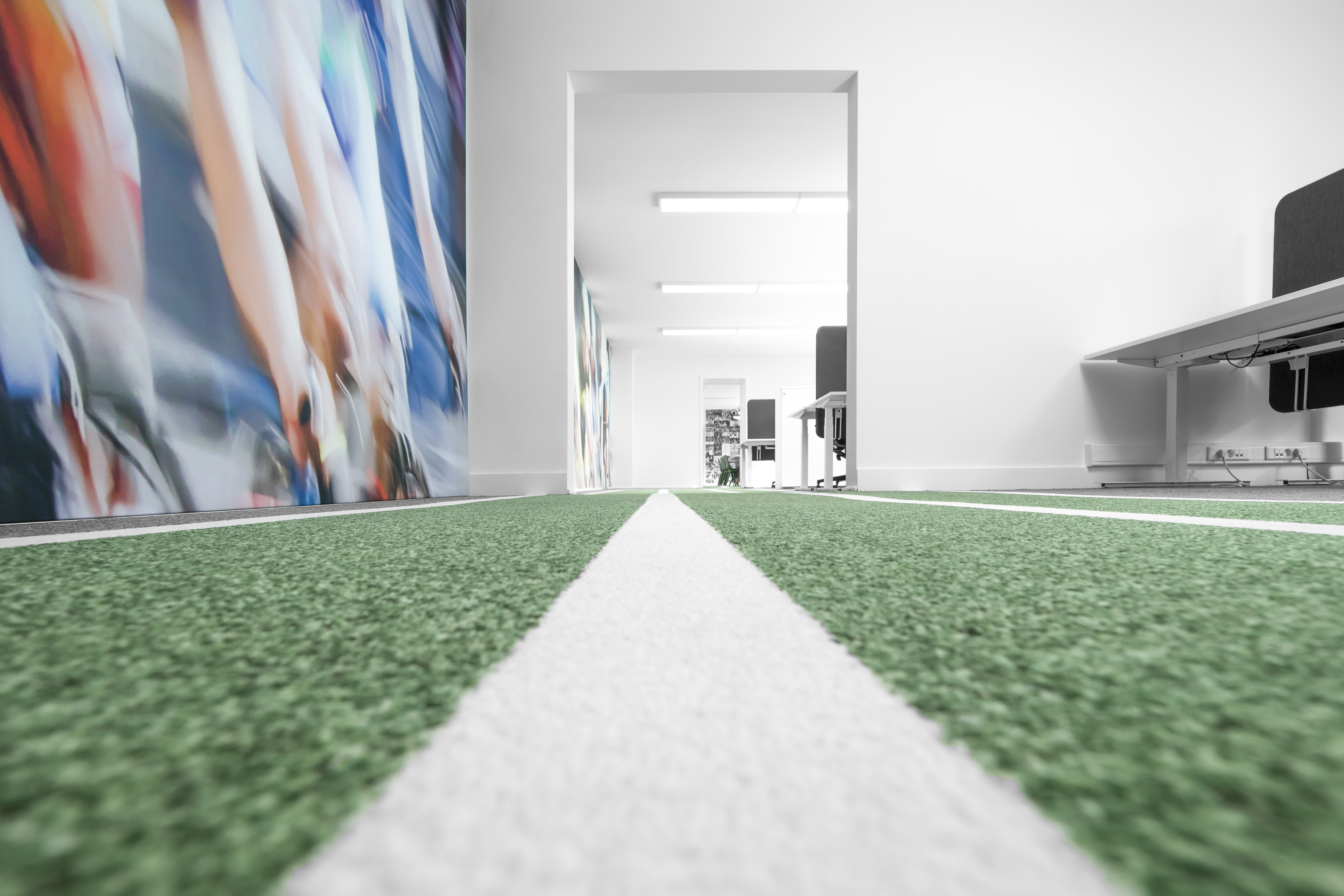 Om het idee van de looppiste tot uitvoering te brengen ging Studio Meraki op zoek naar een goede partner. PXL Carpets is gespecialiseerd in het bedrukken van tapijt en zij hebben onze wensen perfect vervuld. Het tapijt wordt bedrukt in stroken met een breedte van 2 m die achter elkaar worden gelegd. “Het was even spannend om de piste perfect te krijgen met de voorziene bochten vanaf de inkom tot mooi uitgelijnd op de muur in de vergaderzaal. Maar het resultaat is echt super”, besluit Studio Meraki.