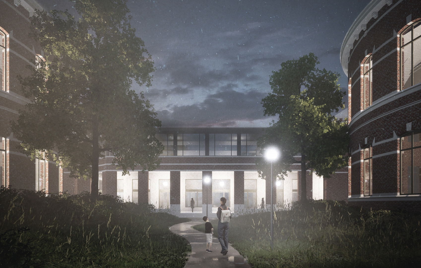 Nieuwe gaanderijen, verbindende elementen en zorgvuldig geplaatste nieuwbouwvolumes ondersteunen deze historische structuur zonder haar te overheersen. Samen creëren ze een nauw afgestemde dialoog tussen erfgoed en hedendaagse architectuur. Hierdoor ontstaat een evenwichtig geheel waarin het patrimonium niet wordt bevroren, maar geactiveerd als ruggengraat van de toekomstige stadsontwikkeling - klaar voor een breed en duurzaam gebruik.