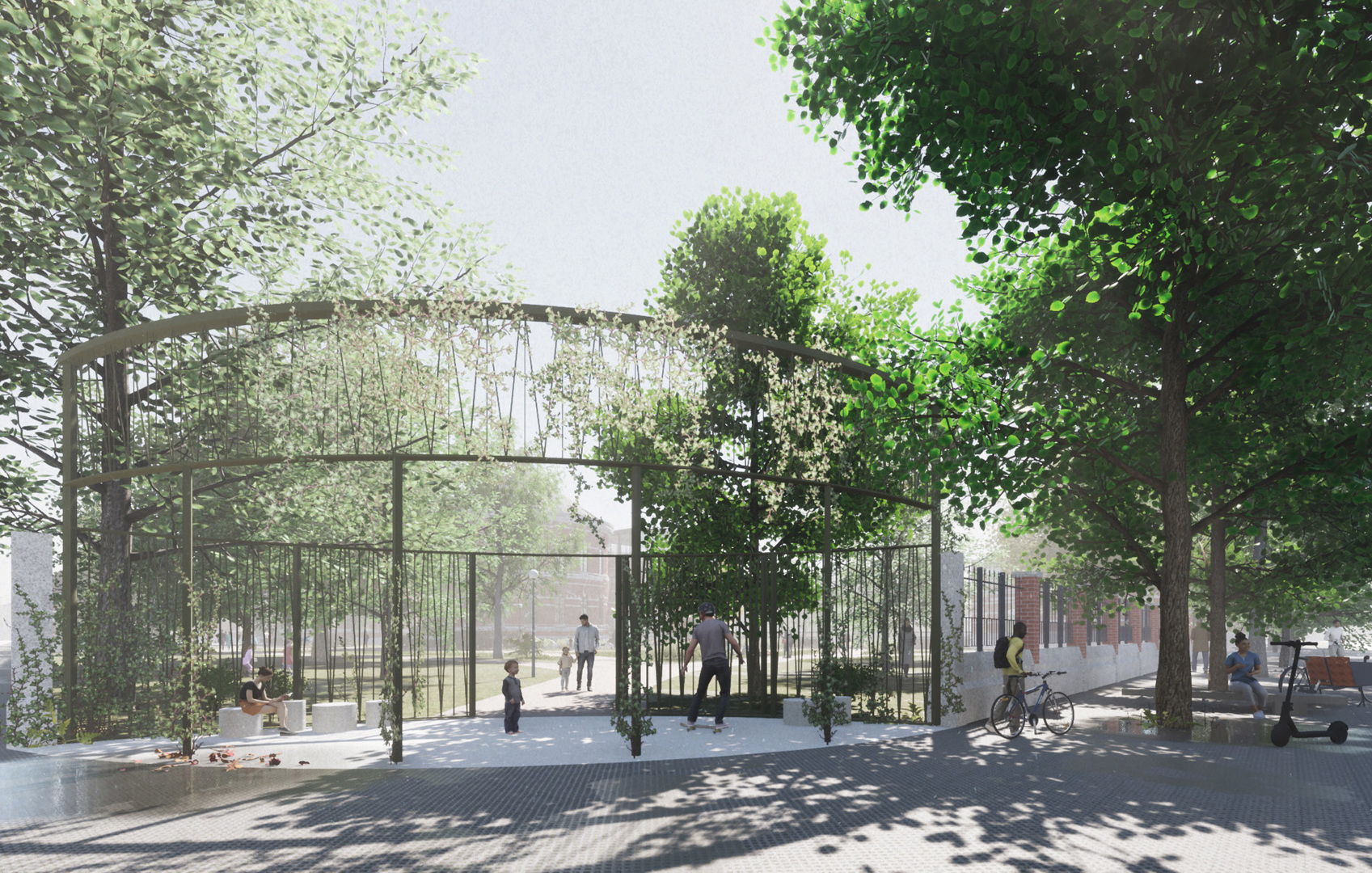 Het bestaande hekwerk blijft grotendeels behouden om het park ’s avonds te beschermen, maar wordt aangevuld met nieuwe toegangen en groene voorpleinen die naar het park leiden. Deze kleine voorpleinen vormen een zachte overgang tussen het dense stedelijke weefsel en de open ruimte. Lichte pergola’s en groene overkappingen zorgen voor schaduw, verblijfskwaliteit en een uitnodigende relatie met het park, waardoor de groene structuur niet alleen functioneel maar ook ruimtelijk aantrekkelijk wordt geïntegreerd in de buurt.
