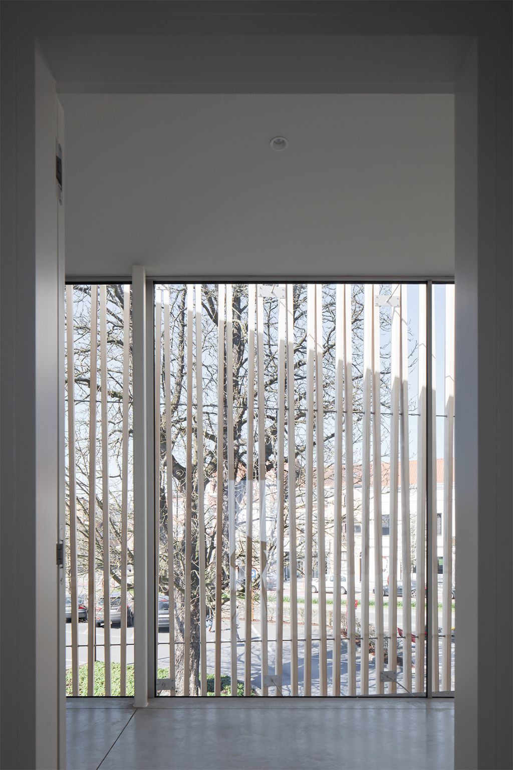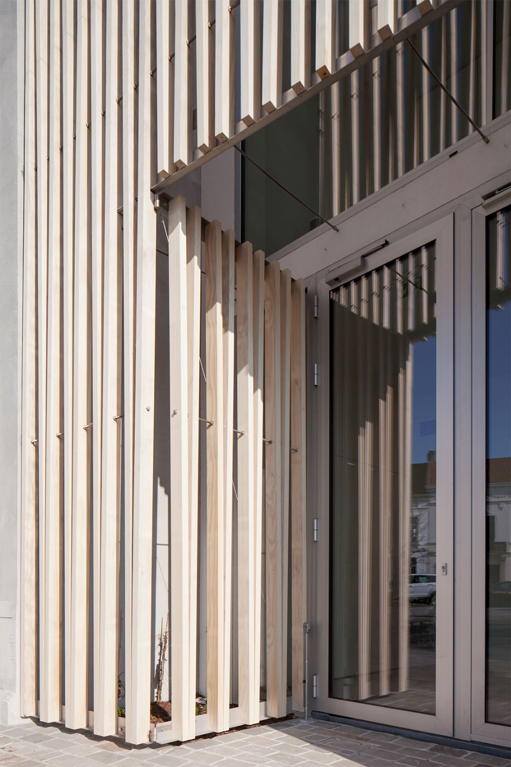 Eyecatcher van het project is ongetwijfeld de houten ‘filter’ aan de straatzijde. Die werd aan het ontwerp toegevoegd omwille van esthetische maar ook functionele redenen. De verticale structuur beperkt de inkijk vanaf de straat zonder daarbij de lichtinval te beperken en moet verhitting van het gebouw voorkomen. De voorzetwand volgt het profiel van de straat, terwijl de gevel zelf niet gelijkloopt met het voetpad. Tussen de houten filter en voorgevel van het medisch centrum ontstaat zo een spievormige ruimte, die het uiteindelijke architecturale effect alleen maar ten goede komt. Een poort in de houten structuur opent zich naar binnen.