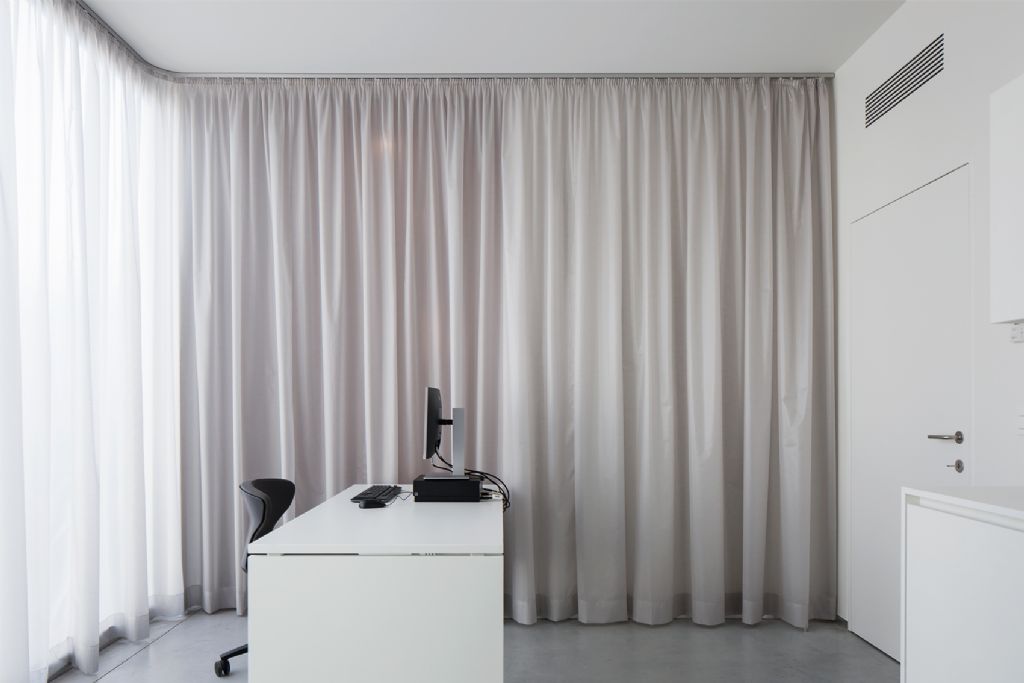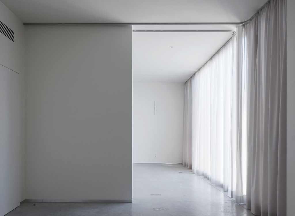 Ook binnen primeert eenvoud, met gepolierde betonvloeren en trap en gepleisterde wanden en plafonds. Verdiepingshoge gordijnen in alle ruimtes zorgen voor een zekere huiselijkheid en bieden zio tegengewicht voor die harde materialen. De gordijnen verzorgen bovendien een aangename galmtijd. Achteraan werd gebruik gemaakt van doekzonwering in de vorm van muggenramen.