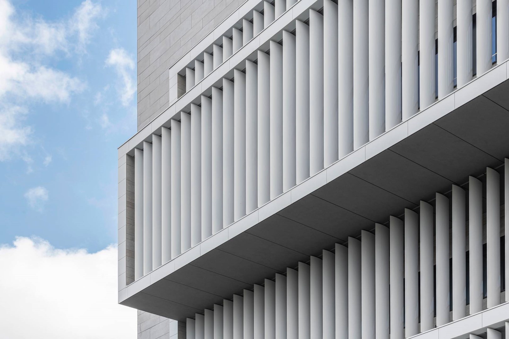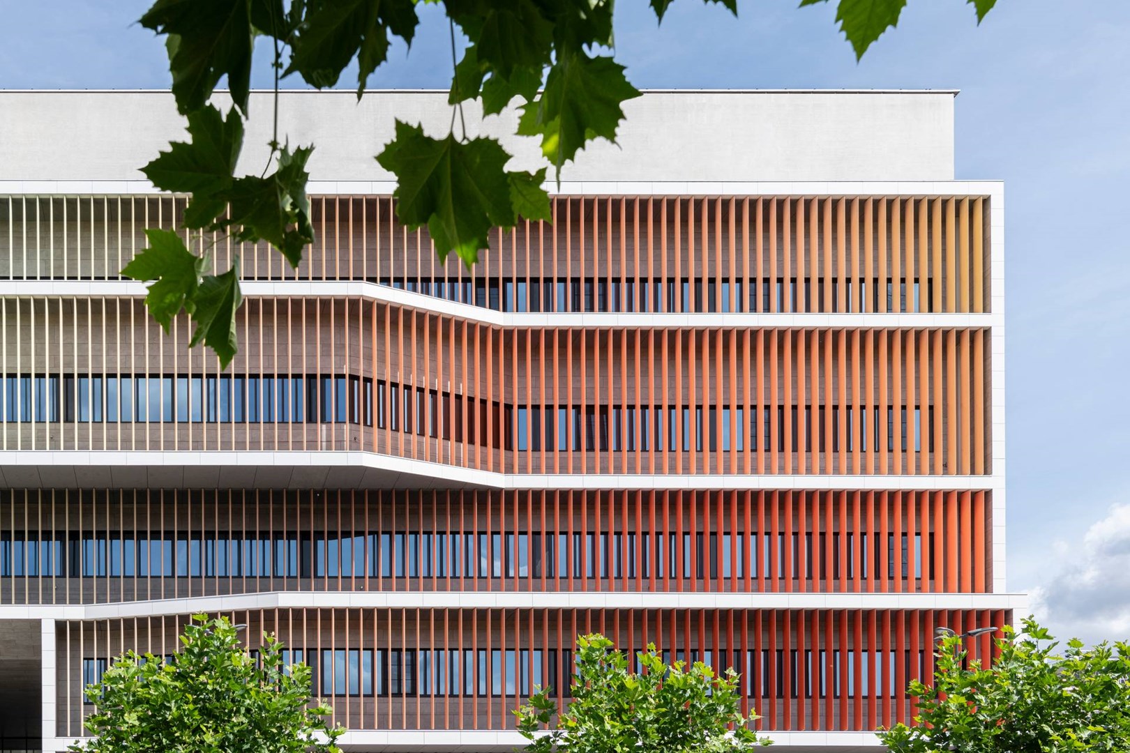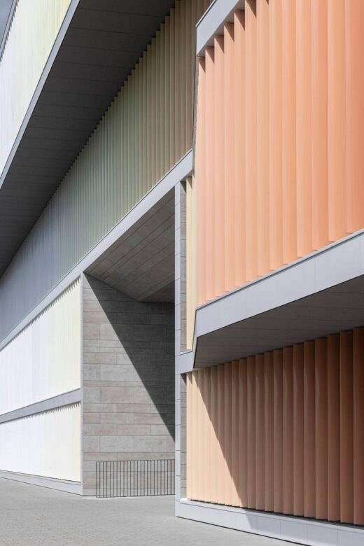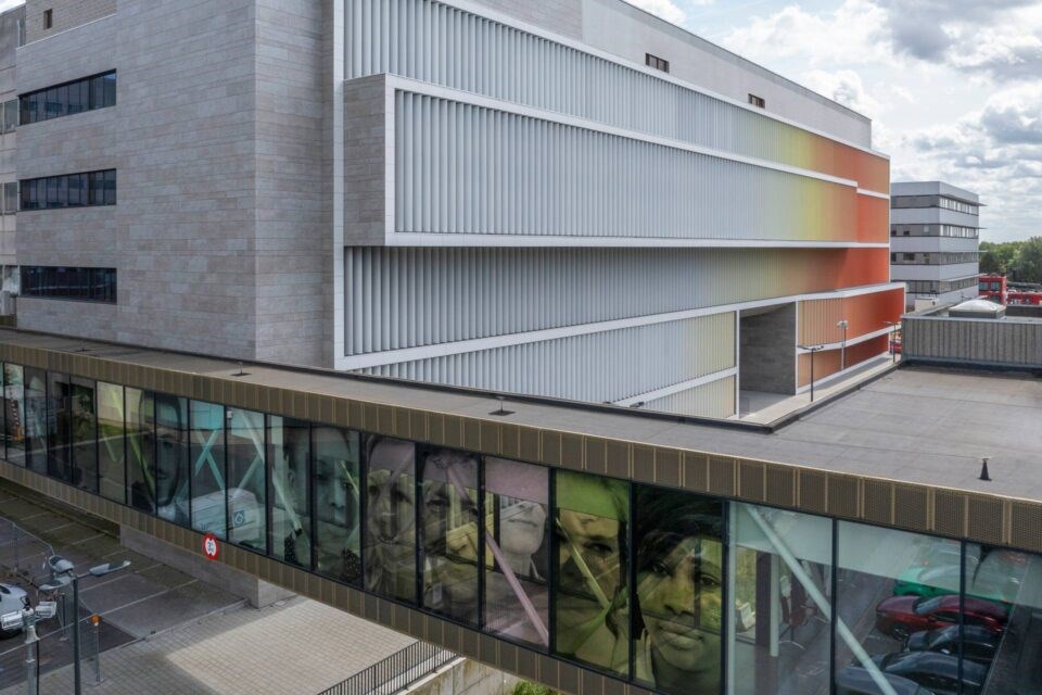 De pure en eigentijdse aanblik bevat een knipoog in de westgevel, met de opvallende zonwering, tegelijk een geïntegreerd kunstwerk. De verticale mobiele lamellen tonen een subtiel kleurverloop over de volle gevellengte en doorbreken zo het monochrome bouwvolume.