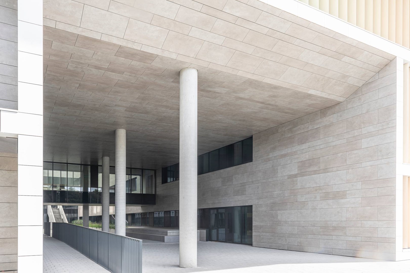 Aan de buitenkant is het medisch-technisch blok opgeleverd. Materiaal en kleur zorgen voor een naadloze integratie in de bestaande gebouwde omgeving. Keramische tegels met reliëf en verschillende hoogtes verlevendigen de gevels van het sobere volume. Diepliggende raamstroken in donker aluminium verhogen de dynamiek: ze doorsnijden de gevel en introduceren een sterk contrast.