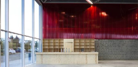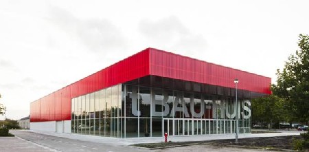 In 't Bau-huis zijn alle programma’s ondergebracht in één doos. Het geheel, oud en nieuw, wordt ingepakt met translucente rode polycarbonaatplaten. De nieuwe huid laat toe de bestaande hal te isoleren en het complex een expressieve aanblik te geven langs de spoorweg. De inwendige activiteit wordt zichtbaar en ’s nachts letterlijk uitgestraald.