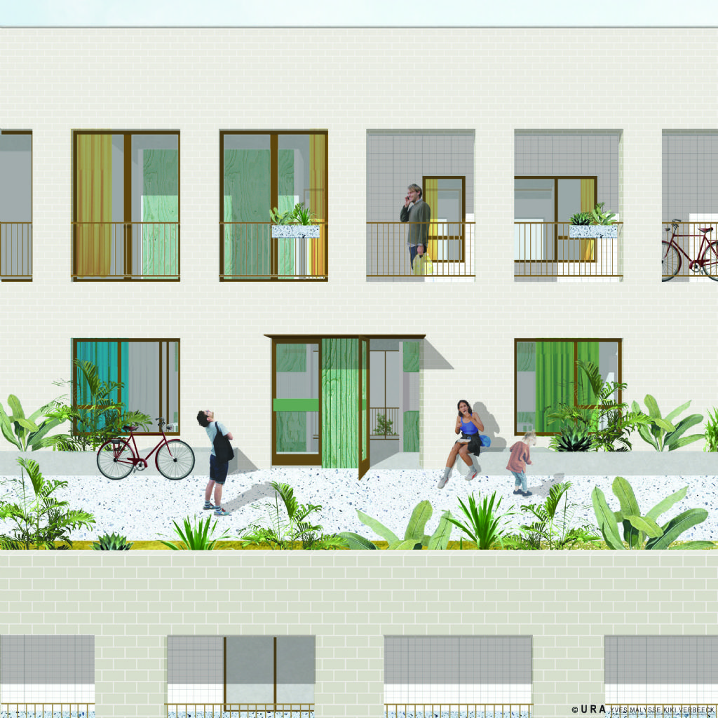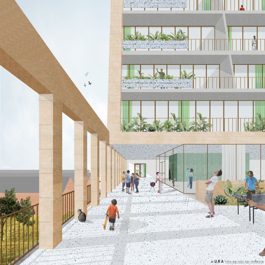 Het gebouw krijgt een geheel eigen identiteit, zowel in vorm als in materialisering. Een eigentijdse woon-ziggurat van buiten- en binnenruimtes ontwikkelt zich bovenop de publieke plint en geeft licht, zicht en ruimte aan de diverse bewoners. Vastberaden om een tijdloos gebouw te maken, kiest URA Yves Malysse Kiki Verbeeck resoluut voor een duurzaam materiaal. Het volledige gebouw wordt aan de buitenzijde opgetrokken uit natuursteen. De binnenzijde is een samenspel van baksteen, tegels en groen.