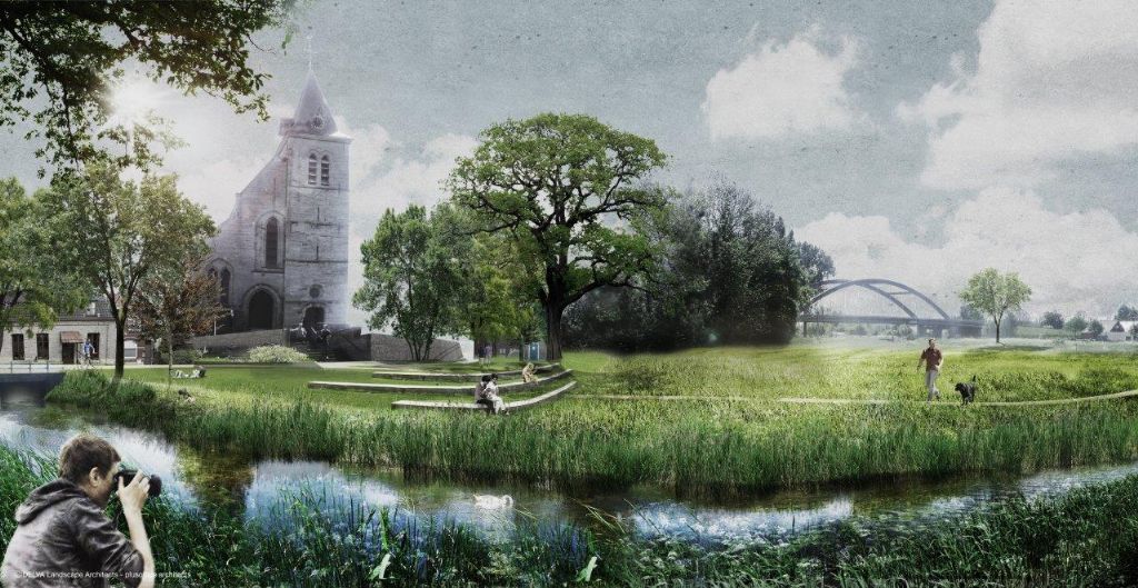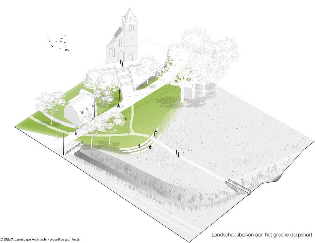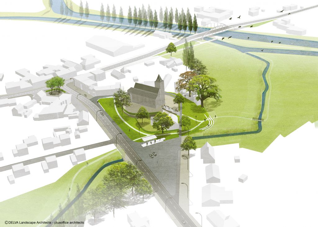 Team Delva-Plusoffice: "Om de relatie met de kerk nog te versterken, leggen we ook de wandelroute langs het landschapsbalkon, de wandelaar komt als het ware aan op het kerkvoorplein en kan hier ten volle van de landschappelijke en historische kwaliteiten genieten. Hiervoor leggen we ook een klein brugje aan over de Grote Spierebeek zodat ook deze in het verhaal wordt betrokken."