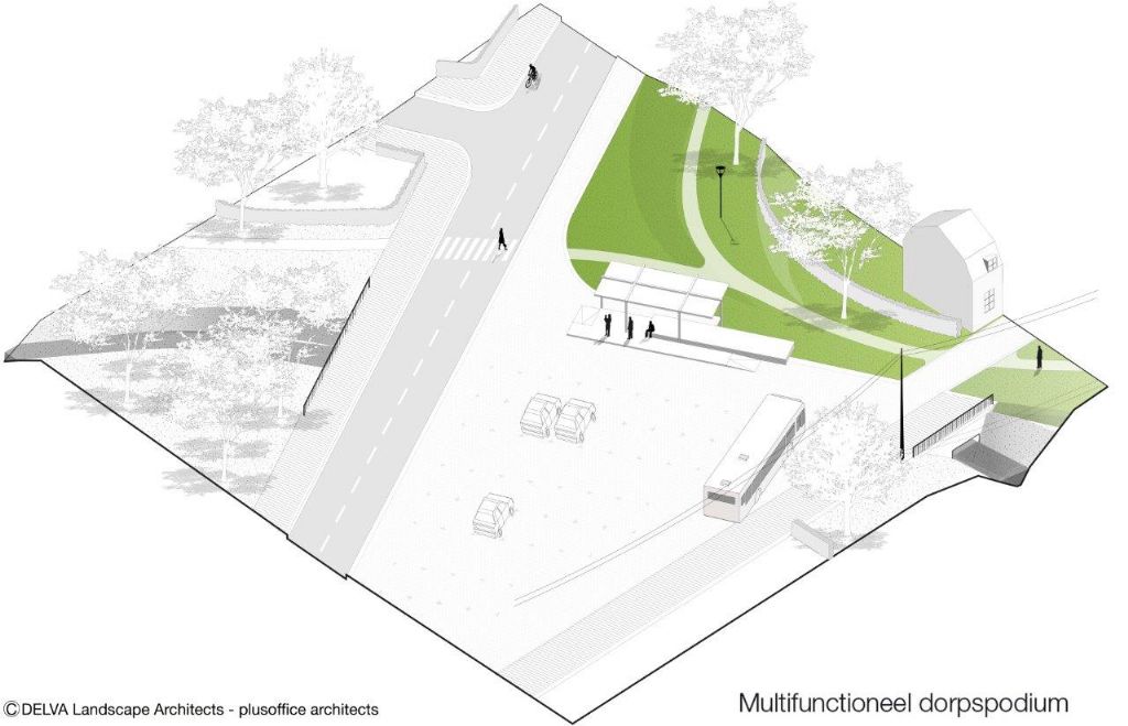 De elementen geven op een eenvoudige en slimme manier vorm aan de heroriëntatie van de verschillende ruimtes, geven ze een nieuw adres en brengen de deelruimtes opnieuw met elkaar in verbinding. "We kiezen ervoor de kerk weer te vergroenen door de heuvel met zijn voeten in het groen te zetten. Die groene ruimte wordt cruciaal in de verbinding van de twee valleidelen én wordt heel leesbaar als figuur in het dorp. Het dorpspodium zetten we in als overgang tussen het plein en de groene kerkomgeving. Het dorpspodium is de organiserende kracht van het ontwerp. Vanuit deze twee elementen wordt de verdere omgeving vorm gegeven aan de hand van een aantal krachtlijnen", klinkt het.