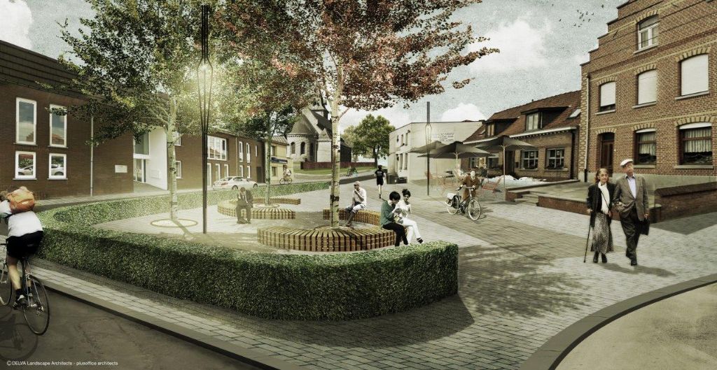 Aan het kruispunt met de Oudenaardseweg, wordt de historische ‘Place’ weer de prettige verblijfsruimte die het ooit was, met een sterk teruggedrongen dominantie van de infrastructuur. "We behouden wat strikt nodig is voor de verkeersafwikkeling. Enkele flinke bomen en een lage haag zorgen voor intimiteit en afbakening van de overige ruimte. Uniforme, ingetogen verharding, passende verlichting, een S-vormige bank en uitbreidingsmogelijkheden voor de terrassen vormen de ingrediënten voor een hernieuwde vitaliteit van dit dorpshart. De gebruikte bestrating loopt naadloos verder in de aanleg van het Robecijnplein en de straten tussen beide centrumpleinen", besluit het team.