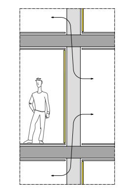 Om de geluidsisolatie tussen twee appartementen zo efficiënt mogelijk te verbeteren, worden de voorzetconstructies best allemaal aan dezelfde zijde van de scheidingswand aangebracht (zie afbeelding 2). Door binnen dezelfde ruimte consequent alle wanden, de vloer en het plafond van een voorzetconstructie te voorzien, wordt er een zogeheten doos-in-doosoplossing gecreëerd: de ontkoppelde ‘binnendoos’ isoleert de ruimte akoestisch quasi volledig van haar omgeving.