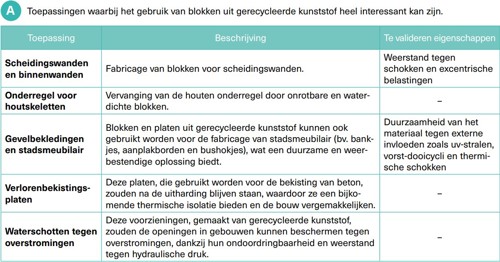 De blokken uit gerecycleerde kunststof, die ontwikkeld werden in het kader van het Recyabri-project, openen de weg voor heel wat bouwtoepassingen. Onderstaande tabel geeft een overzicht van de beoogde toepassingen en de eigenschappen die nog gevalideerd moeten worden.
