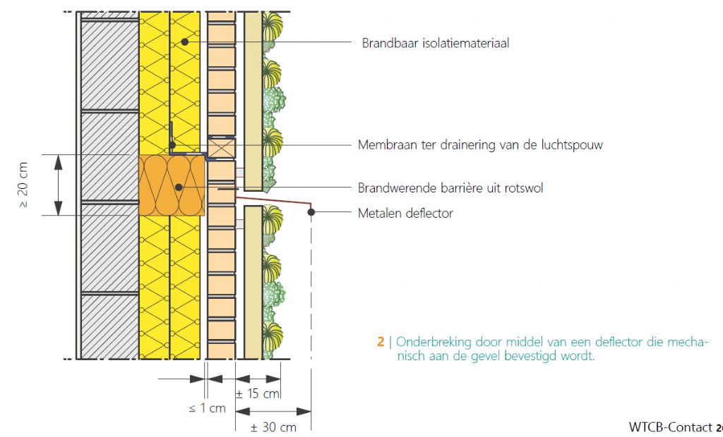• het installeren van een brandwerende barrière om de twee verdiepingen of ter hoogte van elke gevelopening. Dit laat toe om de vegetatie en de eventuele doorlopende luchtspouw achter de groene gevel te onderbreken (zie afbeelding 1). Het kan hier bijvoorbeeld gaan om een deflector uit een staalplaat (geen aluminium) met een dikte van ten minste 1 mm die mechanisch bevestigd wordt (zie afbeelding 2). Een horizontale oversteek van 15 cm ten opzichte van de begroende zone wordt als veilig beschouwd. Deze barrières worden in het verlengde van de barrières geplaatst die vereist zijn om de brandbare isolatie van middelhoge gebouwen te onderbreken volgens de huidige regelgeving (zie de WTCB-Dossiers 2020/3.4, § 4.2.1)