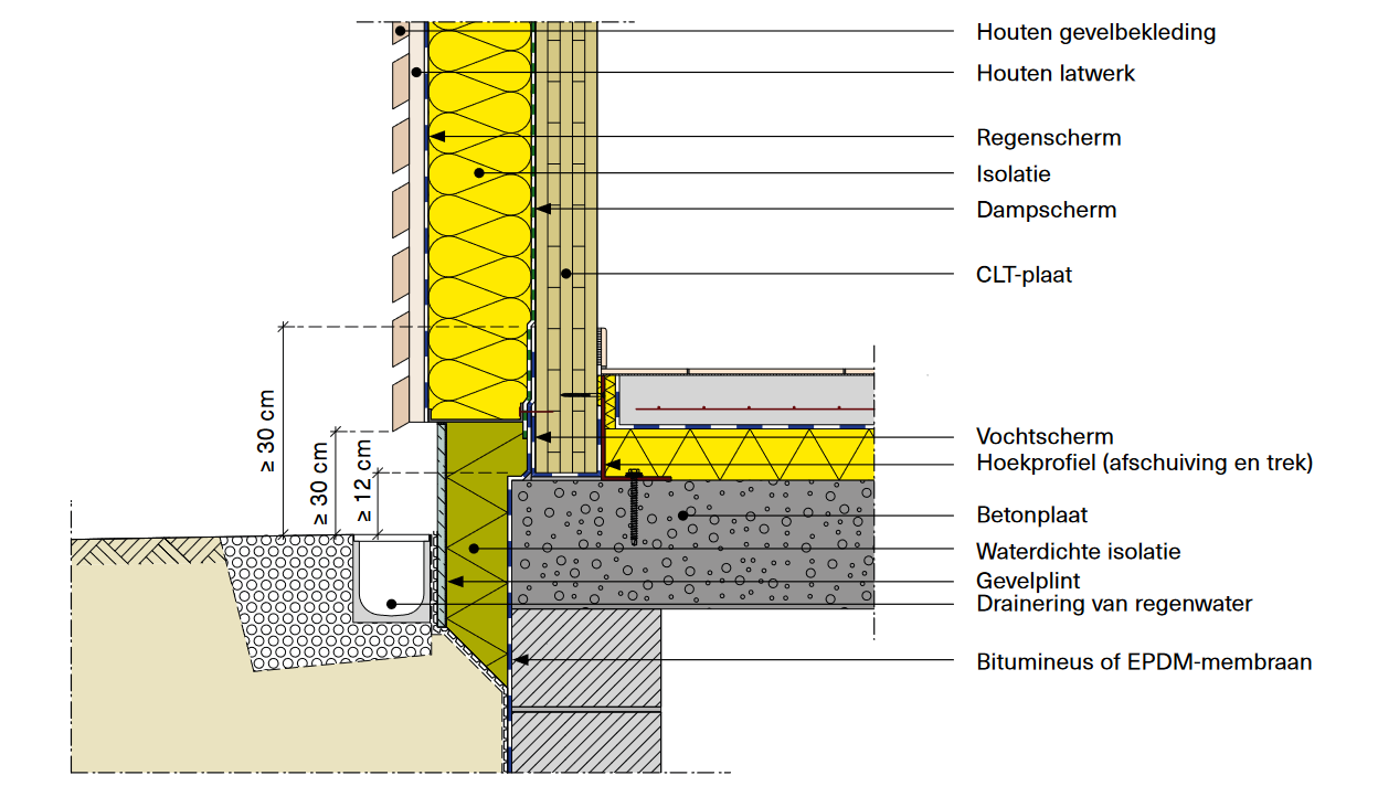 De onderregel of de onderzijde van de CLT-platen wordt over het algemeen minstens 20 cm boven de afgewerkte buitenvloer geplaatst. Dit veiligheidsniveau kan verlaagd worden tot maximum 12 cm (zie afbeelding), op voorwaarde dat: