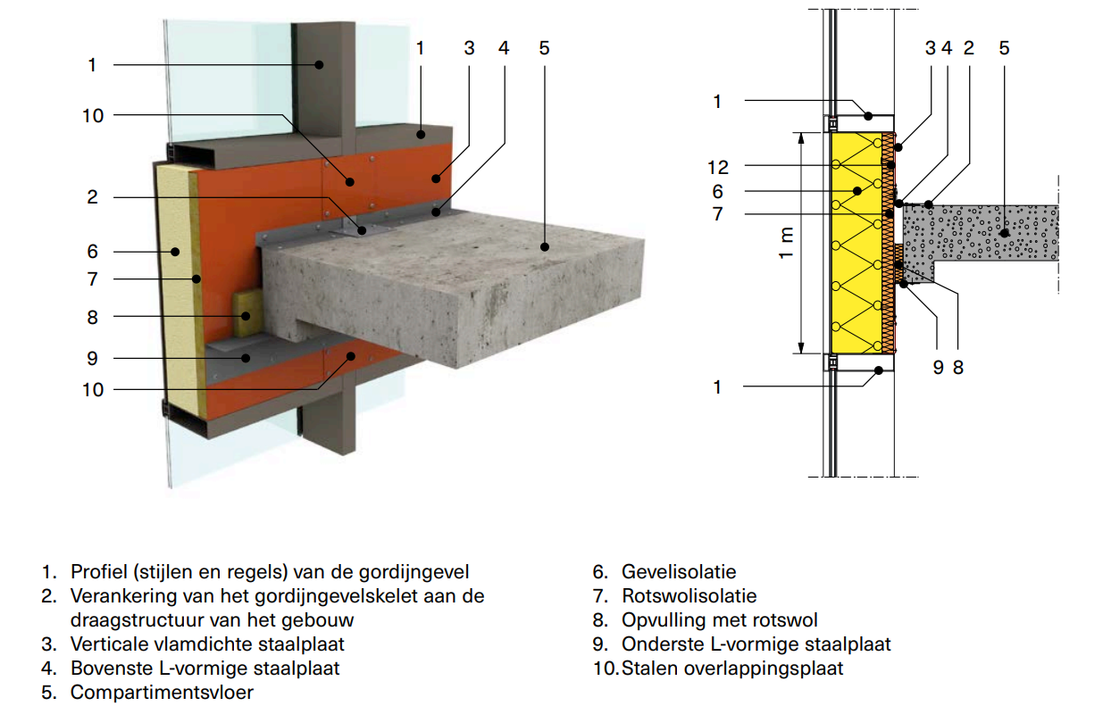 Het vlamdichte element moet opgebouwd zijn uit verticale volle staalplaten van ongeveer 1 tot 2 mm dik (zie 3 in afbeelding 2) die op de horizontale profielen (1) van de gordijngevel bevestigd worden. Deze platen moeten elkaar minstens 30 mm overlappen. Hierop moet een rotswolisolatie (7) (dikte ≥ 60 mm en dichtheid ≥ 45 kg/m³) aangebracht worden door middel van een mechanische bevestiging,