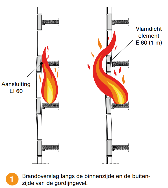 • de gevel ter hoogte van elke compartimentsvloer een vlamdicht element met een brandweerstand E 60 en een ontwikkelde lengte van 1 m moet bevatten (1)