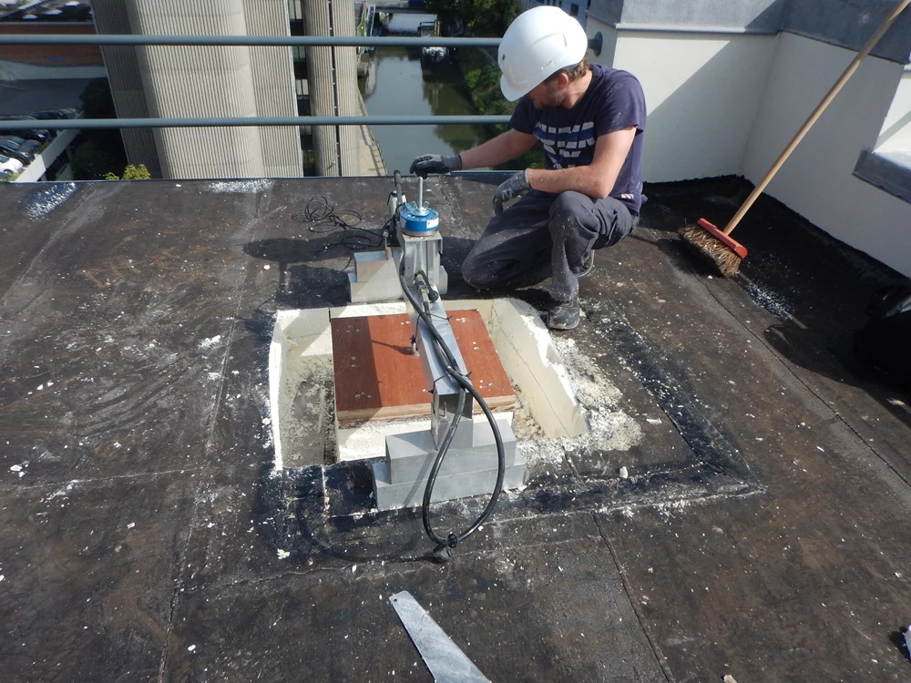 - eerst wordt er op de dakafdichting een stijve plaat (bv. uit multiplex) van 50 cm x 50 cm verlijmd