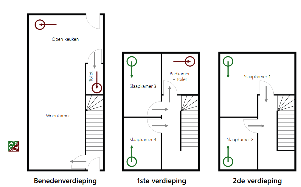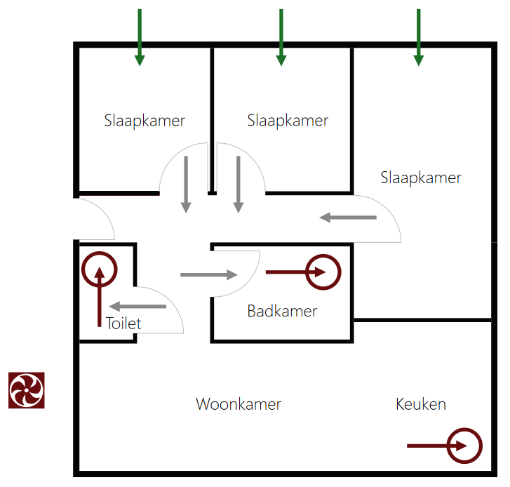 • mechanische toevoer van verse lucht in elke slaapkamer en vrije doorstroom naar de nachthal (bijvoorbeeld via een spleet onder de deur)