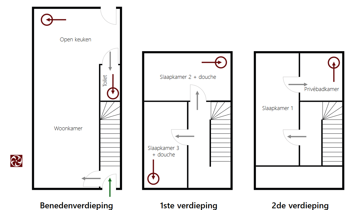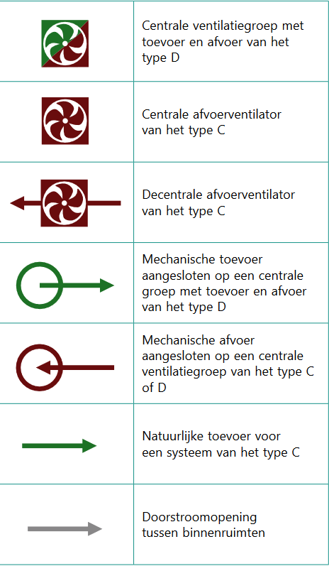 • mechanische afvoer in de open keuken en in de andere natte ruimten (bv. badkamers en toiletten).