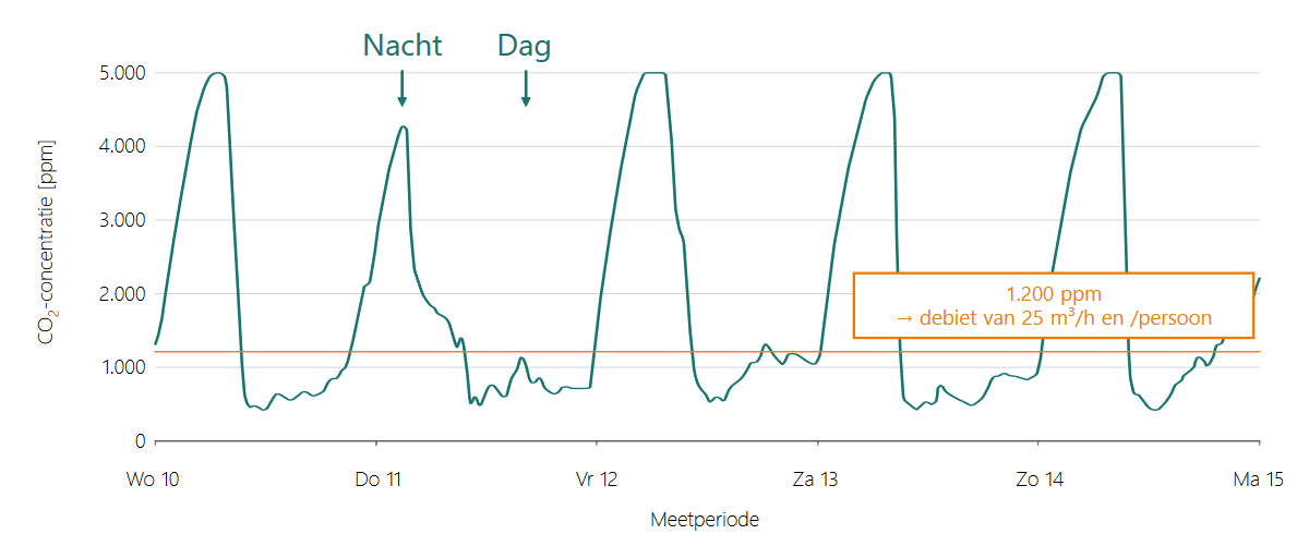 Afbeelding 1 geeft de evolutie weer van de CO2-concentratie in een slaapkamer van één van de woningen zonder ven-tilatiesysteem. Daaruit blijkt dat de concentratie ’s nachts oploopt tot 5.000 ppm (parts per million). Ter vergelijking: de CO2-concentratiewaarde voor een debiet van 25 m³/h per persoon (voor een rustige activiteit) bedraagt 1.200 ppm.