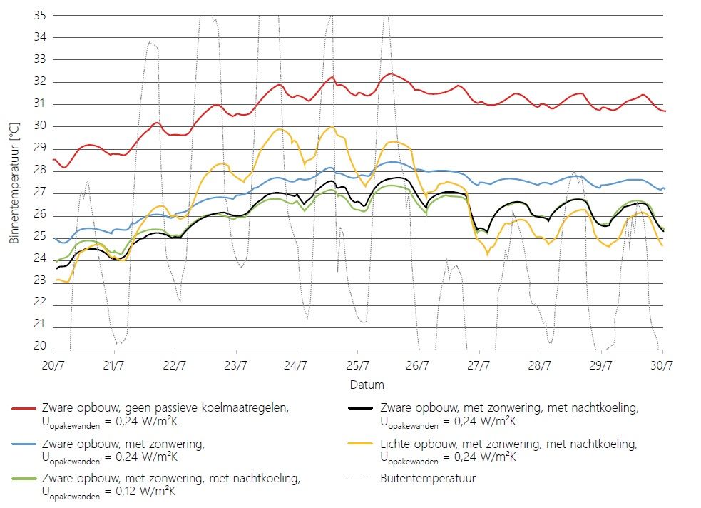 De afbeelding op p. 9 toont de simulatieresultaten voor een vrijstaande woning tijdens de meest extreme hittegolf (zomer van 2019). In een standaard geïsoleerde woning (Uopakewanden = 0,24 W/m²K) met een massieve, zware opbouw waarin geen passieve koelmaatregelen toegepast worden, zien we de temperatuur in de slaapkamer pieken op 32,5 °C (rode curve). Wanneer de vensters in dezelfde woning voorzien worden van een zonwering, dan kan dit maximum met 4 °C gereduceerd worden (blauwe curve). Dit neemt echter niet weg dat de warmte na de piek nog een tijdje in de woning blijft hangen. Wanneer de vensters op de juiste momenten opengezet worden om nachtkoeling toe te passen, dan kan de temperatuur ’s nachts teruggebracht worden tot ongeveer 26 °C (zwarte curve).