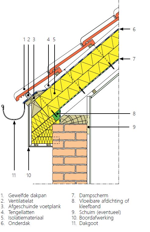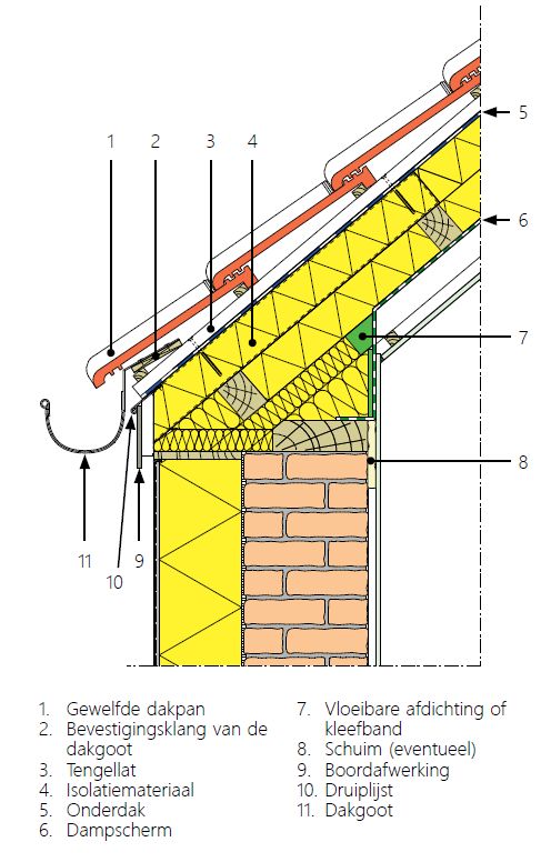 Op vraag van het Technisch Comité Dakbedekkingen legt een werkgroep zich momenteel toe op de uitwerking van specifieke aansluitingsdetails voor langs de buitenzijde geïsoleerde daken (*). Deze werkgroep heeft bovendien ook nog een derde oplossing voorgesteld. Deze bestaat erin om de dakgoot op de tengellatten te bevestigen en om de regenwaterafvoer onder de dakgoot aan te brengen (zie afbeelding 2) of via de dakgoot te laten lopen (zie afbeelding 3).