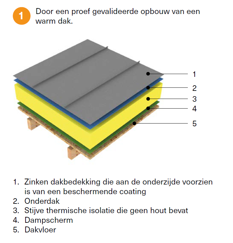 • het aantal onderdelen op basis van hout tussen het dampscherm en de zinken bedekking moet beperkt worden. Deze laatste mag dus niet rechtstreeks op de OSB- of multiplexplaten geplaatst worden, maar moet doorheen de isolatie en het dampscherm op de dakvloer geschroefd worden. Onder het dampscherm mogen wel steeds platen op basis van hout geplaatst worden.