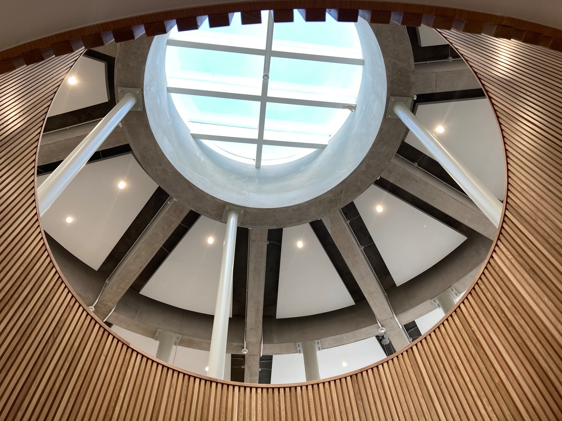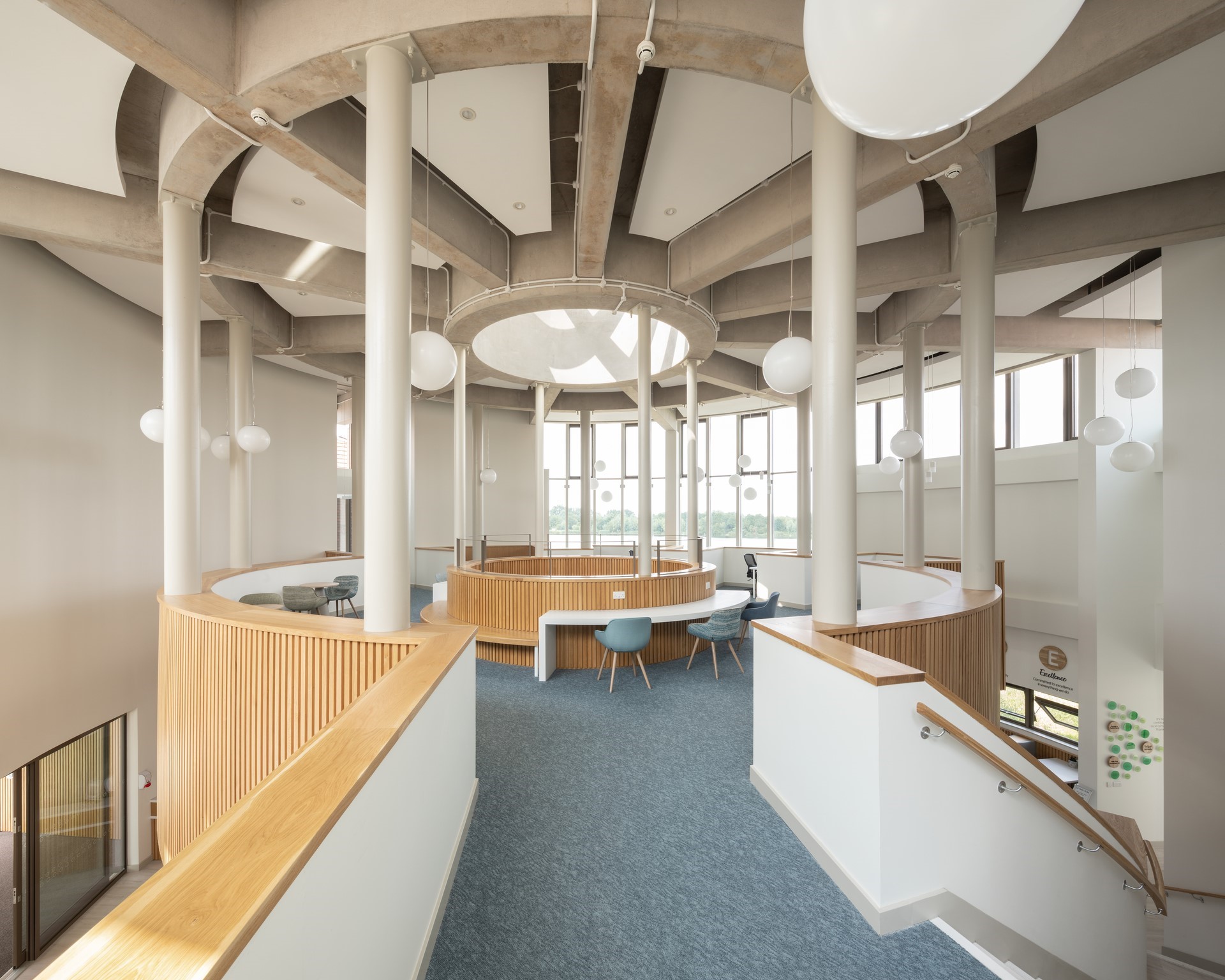 In een deel van het gebouw ontwierp KKE Architects een centrale dubbelhoge betonnen koepel van waaruit 11 betonnen ‘spaken’ zich uitstrekken vanuit de cirkelvormige structuur onder een ronde glazen koepel.