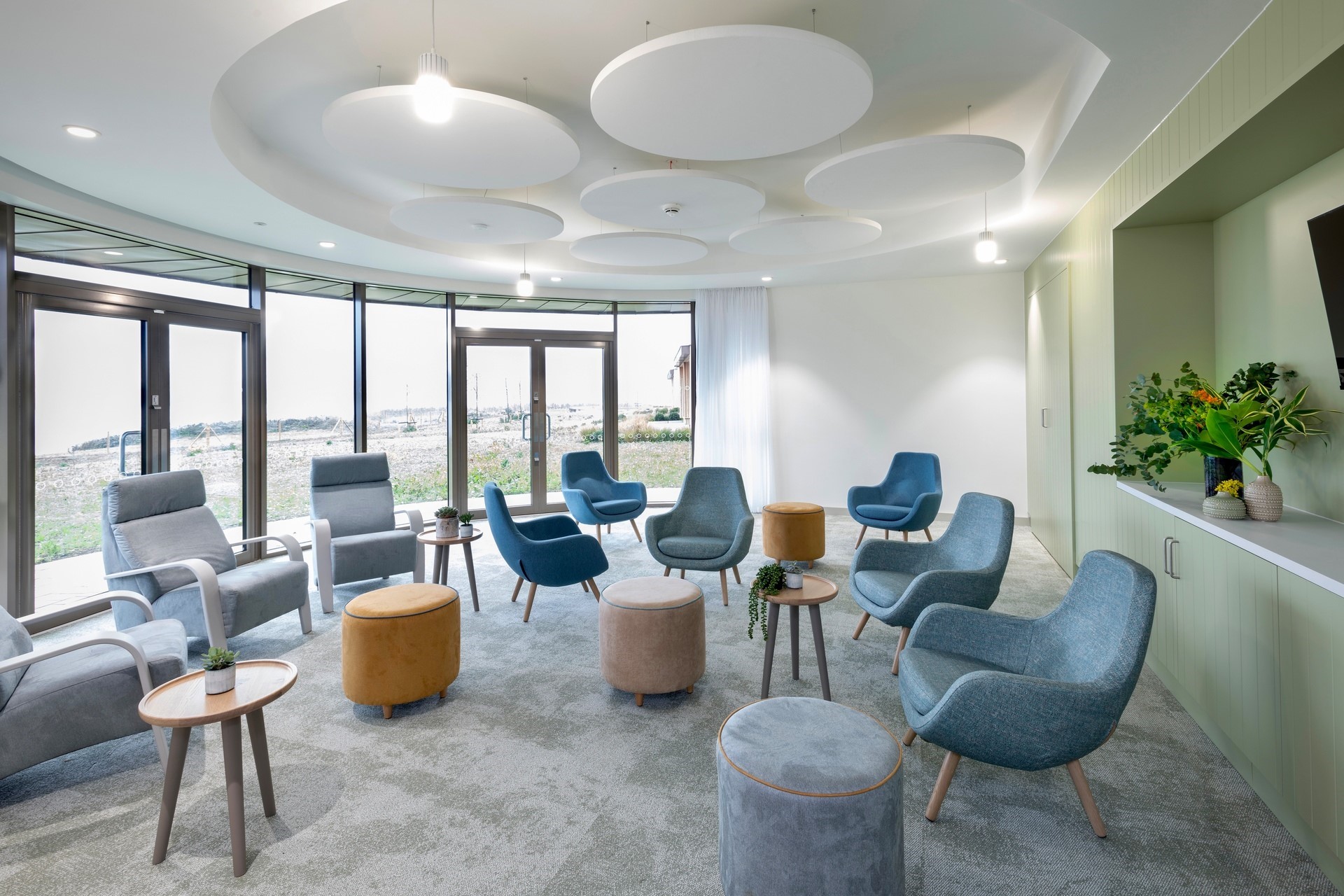 De architect koos ook voor de toepassing van de akoestische Rockfon® Eclipse™ eilanden in het hospice, gerangschikt als een groep elegante cirkelvormige panelen zonder kader die aan draden rechtstreeks aan het plafond hangen, waardoor het lijkt alsof ze in de lucht zweven. Eclipse kan worden voorgeschreven in verschillende vormen met onbeperkte kleurmogelijkheden en is perfect voor installaties met betonkernactivering en waar geen traditioneel verlaagd plafond kan worden geïnstalleerd.
