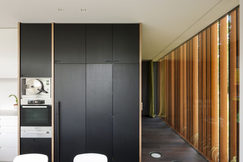 De verweerde staallamellen zetten de lijnen uit op het perceel en zorgen vooral in de avondzon voor een knap visueel spektakel. Ze geven de woning een hybride structuur: gesloten waar nodig, open waar het kan. Aan de achterzijde is het Cortenstaal veel minder prominent aanwezig en zijn het vooral grote raampartijen die domineren.