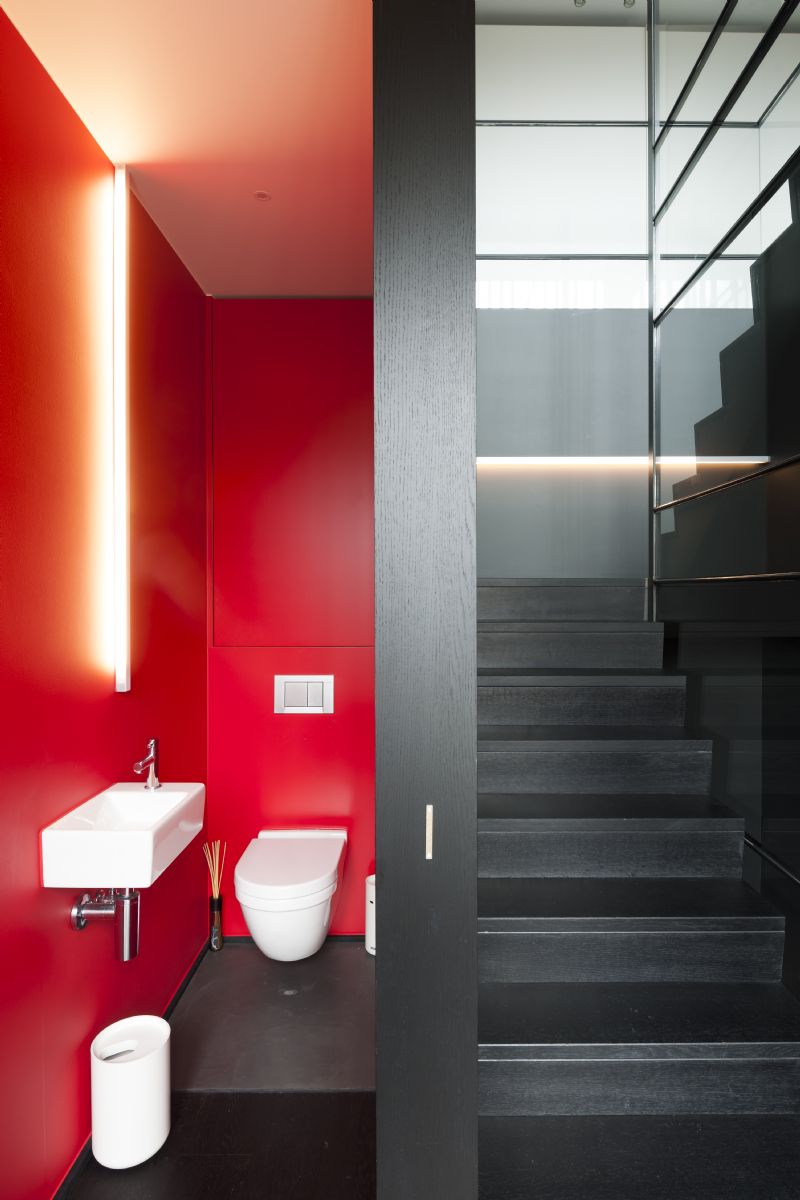 Binnenin is de woning open en ruimtelijk. Eetkamer en living vormen één geheel dankzij de donkere kasten en eiken vloerbekleding, terwijl de overwegend witte keuken een fris contrast genereert. De master bedroom bevindt zich op de eerste verdieping, net als een badkamer, een toilet en een kantoor/loungeruimte. In de nok van het torenvolume hebben de drie kinderen des huizes elk een eigen slaapkamer.