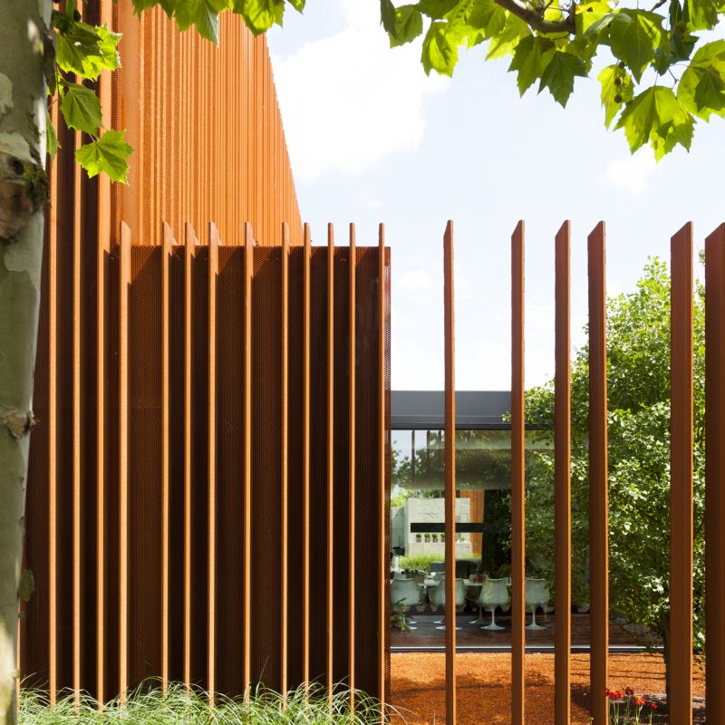 Om het Cortenstaal als gevelbekleding te kunnen gebruiken, was een verregaande detaillering nodig. De lamellen, die doorgaans gebruikt worden in de industrie (onder meer voor damsluizen), werden als het ware als een kapstok over de basisconstructie uit klassiek beton en snelbouwsteen geplaatst. De schilfers die vrijkwamen bij de creatie van de façade zijn rond de Japanse notenboom naast het huis gestrooid, wat zorgt voor een fraai samenspel tussen rood- en groentinten. De strategisch gepositioneerde Cortenstaalkolommen in de tuin zijn bevestigd op een onzichtbare structuur. Ze bakenen de privétuin met terras en zwembad af en geven het perceel zo de nodige samenhang.